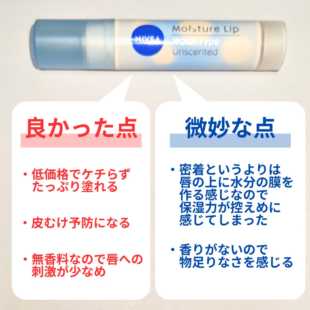 ニベア『モイスチャーリップウォータータイプ無香料』𓈒𓂂𓂃◌𓈒𓐍買いたかったリップがお店になかったので代わりに初めてのこちらの商品を購入。硬めだけど滑らかな塗り心地でした!保湿力は控えめなのでこまめに練り直しが必要。無香料なのも良い◎SPF20...