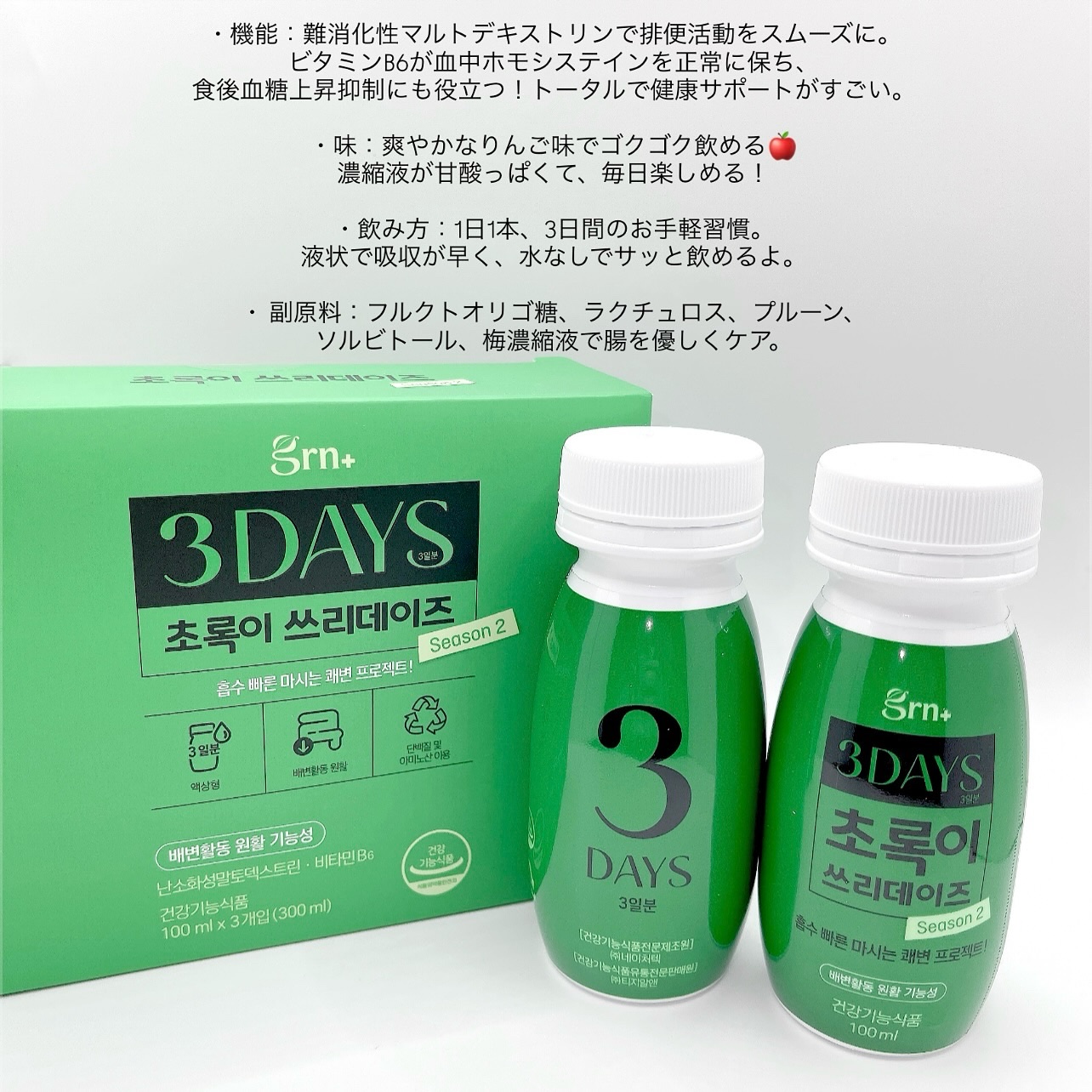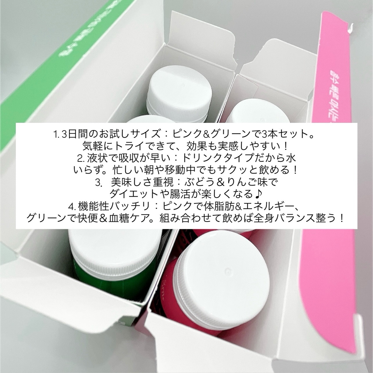 GRN+/3DAYSPINK🩷&GREEN💚PINKスリーデイズ🩷【食前に飲む!糖質カットや体脂肪減少サポート】★特徴◎早い吸収で早い効果を実感!◎体脂肪減少や体内エネルギー生成で機能性のあるドリンク◎甘酸っぱい葡萄味!🍇◎水溶性ビタミンで活...