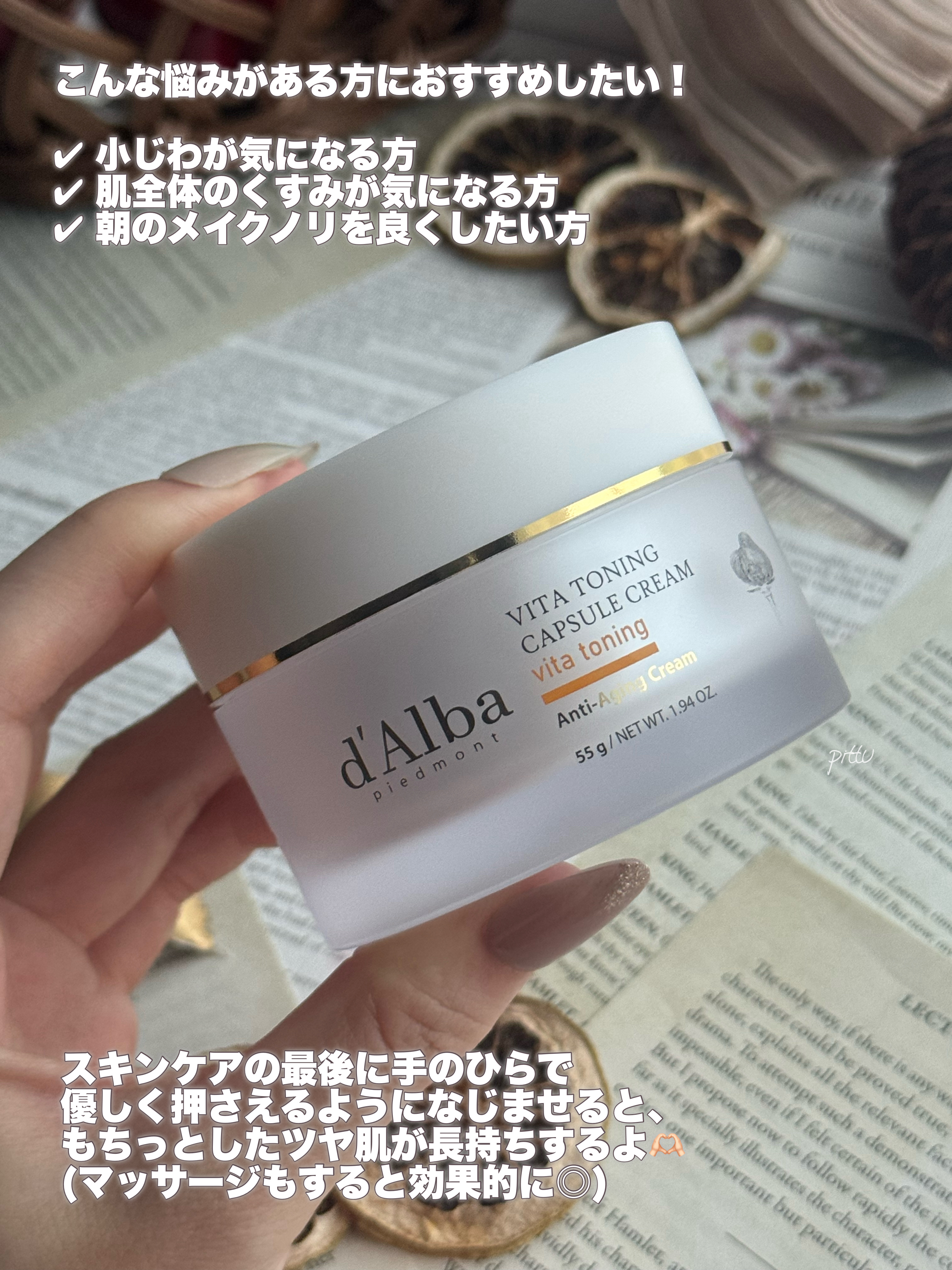 夏の紫外線で疲れた肌にビタミンチャージ💛🟡ダルバビタトーニングカプセルクリーム55g¥3,520ダルバのスキンケアラインで大好きなビタトーニングカプセルクリーム💛純粋ビタミンCとグルタチオンが配合されたクリームベースと、ビタミンE・Kを含んだ...