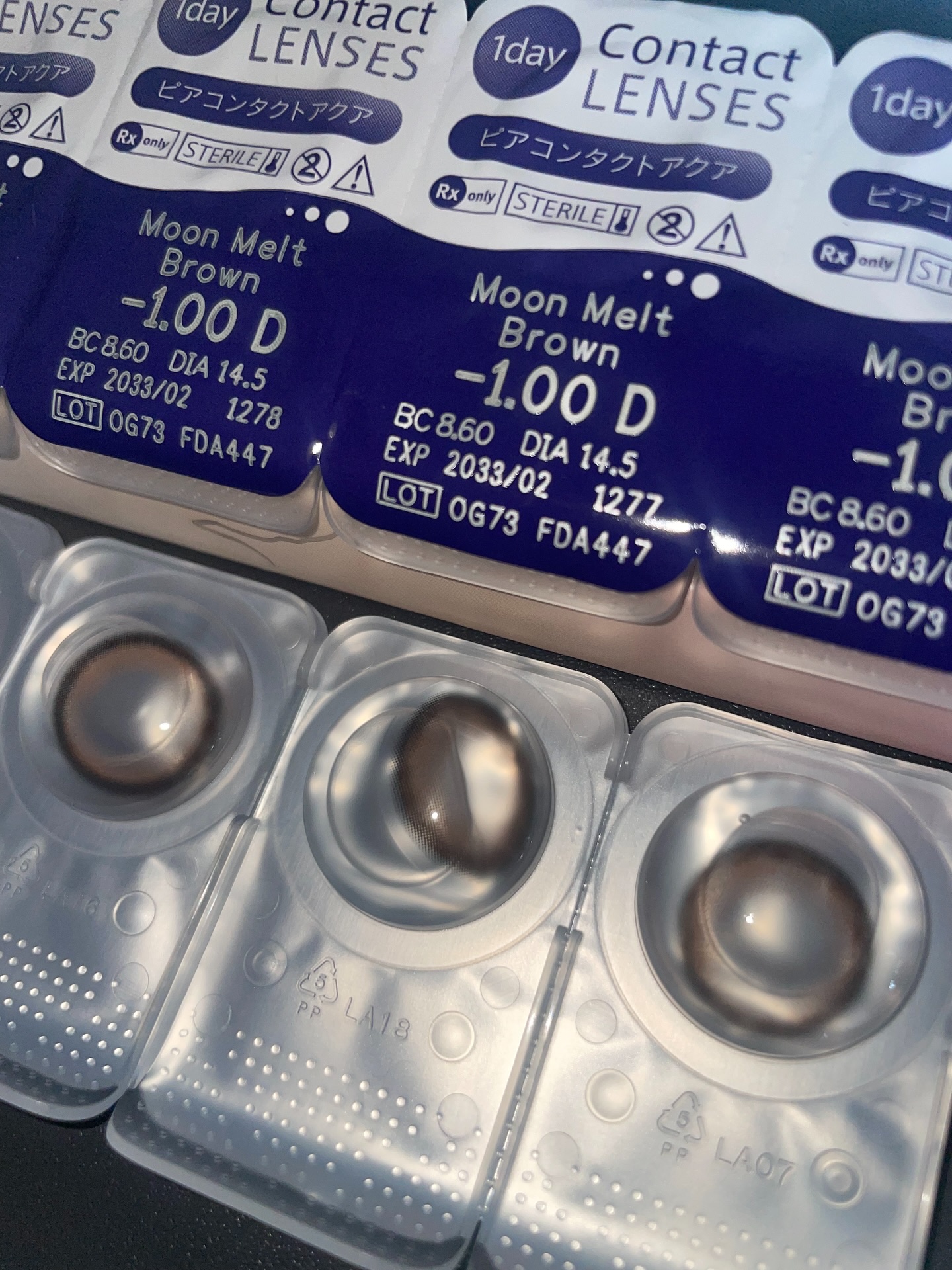 - ※2025年6月以降、商品パッケージ裏面・側面の一部表記を順次変更いたします。尚、これにかかる商品の交換・返品は承っておりません。 ■UVカット 紫外線を99%カットします。 ※UV-A波75%、UV-B波99%カット ■低含水 長時間の装用を考えた、レンズ自体に必要な水分が少ない低含水レンズです。※使用時間には個人差がありますので必ず眼科医の指導に従って下さい。 ■レンズ構造 着色剤がポリマー層によりレンズ内に包埋しています。 ■ 非イオン性レンズ 汚れが付きにくく視界をクリアに保ち、快適さが持続します。※装用感には個人差があります。 ■レンズ形状レンズ形状 フチに丸みをつけより快適な着け心地を目指しました。 Moon Melt Brown(ムーンメルトブラウン) とろける甘さのブラウンカラーに月の光を散りばめた、きらめき水光レンズ。 Cat Pearl(キャットパール) くっきり細フチでまんまるな印象の瞳♡きゅるんと子猫っぽグレーレンズ。 Jelly Quartz(ゼリークォーツ) ぼかし細フチでぷるんと輝くような瞳に、毎日使いたくなる引き算大人盛れレンズ。 カラーコンタクトレンズの不適正使用による眼障害の危険性等などがあります。 ●コンタクトレンズは高度管理医療機器です。不十分な洗浄・消毒など不適切なケアや、長時間・交換期間を超えた装用により、アレルギー性結膜炎、角膜感染症、角膜潰瘍等の重篤な眼障害が発生する危険性があります ●ご使用前に取扱説明書を確認してください 使用上の留意事項 ●眼科医院等を受診してからお求めください ●眼に異常を感じたら直ちにレンズ使用を中止し、お近くの眼科等で診察を受けてください ●医師の指示にしたがってご使用ください ●コンタクトレンズを装用する場合、自覚症状がなくても、眼科医院等での定期検査を受けてください ●レンズに不具合がある場合は使用しないでください