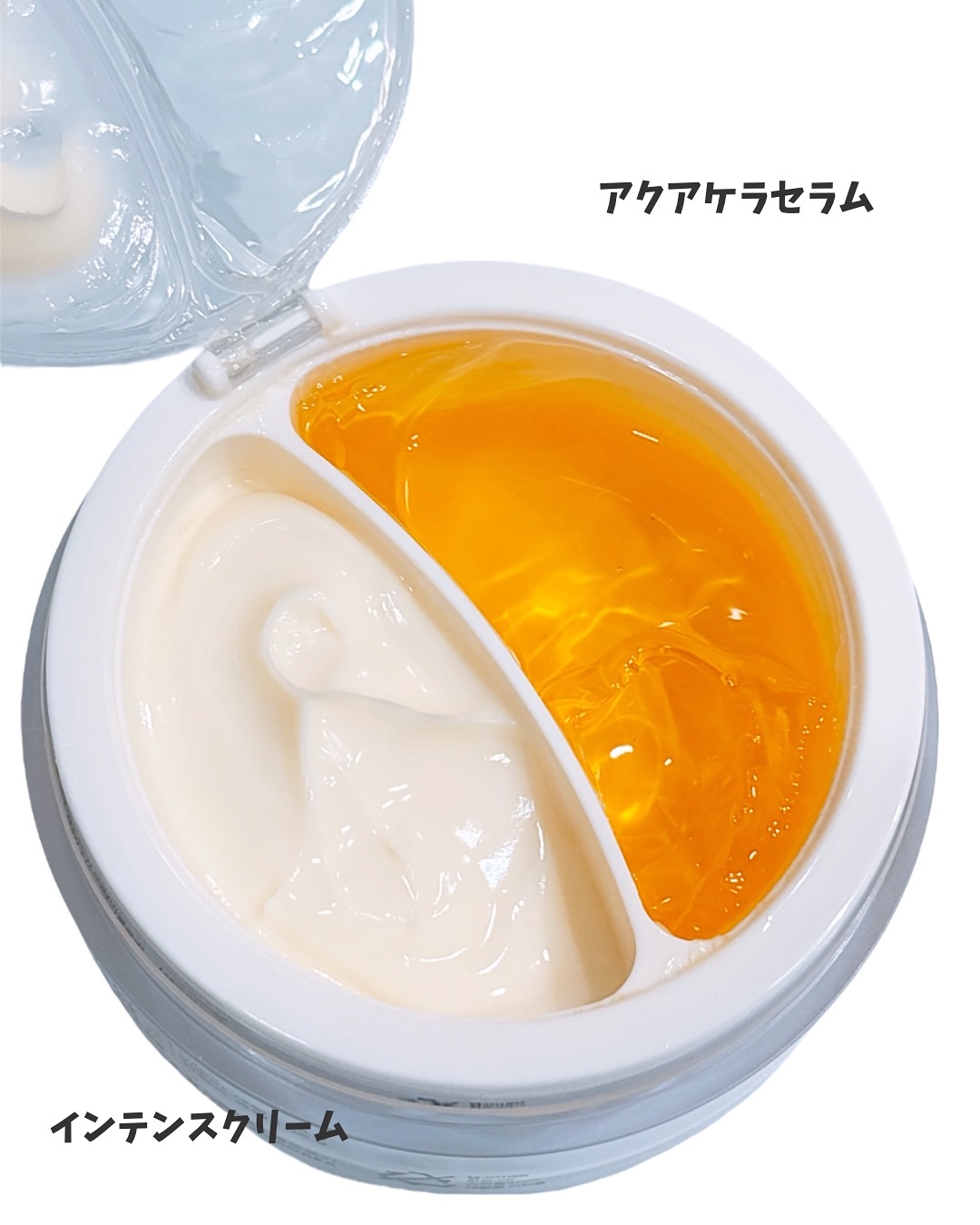 - アクサセラムとインテンスクリームのデュアル・フォーミュラで肌のタイプやコンディションに合わせて 比率を調節してカスタマイズ・ケアします。 ・アクアセラム:ヒアルロン酸、パンテノール、ツボクサエキス*が含まれた、さっぱりとした使用感で肌に水分を与え肌のキメを整えます。*ヒアルロン酸・パンテノール・ツボクサエキス(いずれも保湿成分) ・インテンスクリーム:イタリア産ホワイトトリュフ*が含まれた、もっちりした使用感で肌にうるおいを与えツヤのあるもち肌へ導きます。*ツベルマグナツムエキス(保湿成分) イタリアヴィーガン認証V-LABEL取得 皮膚低刺激テスト済み *全ての方に皮膚刺激が発生しないということではありません。 【使い方】 1. 洗顔後、スパチュラで肌のコンディションによって、セーラムとクリームを適量を取り、 ミックスしてから顔全体に優しく塗り広げ、 吸収させます。※ 必要に応じて、アクアセラムとインテンスクリームは単品でも使用できます。 【使用上の注意】 お肌に異常が生じていないかよく注意して使用してください。化粧品がお肌に合わないとき即ち次のような場合には、使用を中止してください。そのまま使用を続けますと、症状を悪化させることがありますので、皮ふ科専門医等にご相談されることをおすすめします。 (1)使用中、赤味、はれ、かゆみ、刺激、色抜け(白斑等)や黒ずみ等の異常があらわれた場合 (2)使用したお肌に、直射日光があたって(1)のような異常があらわれた場合