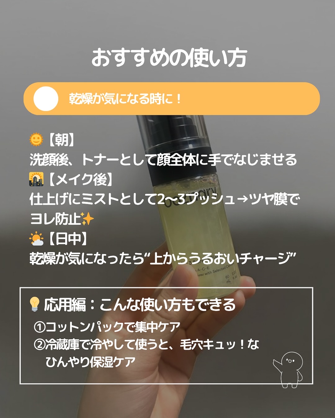 | スキンケアランキング第20位 | スプレーを逆さにしても使えるため なかなか届きにくい背中なども シューっと手軽に保湿できるのも 良いなと思いました☺️ | 詳細を見る | |