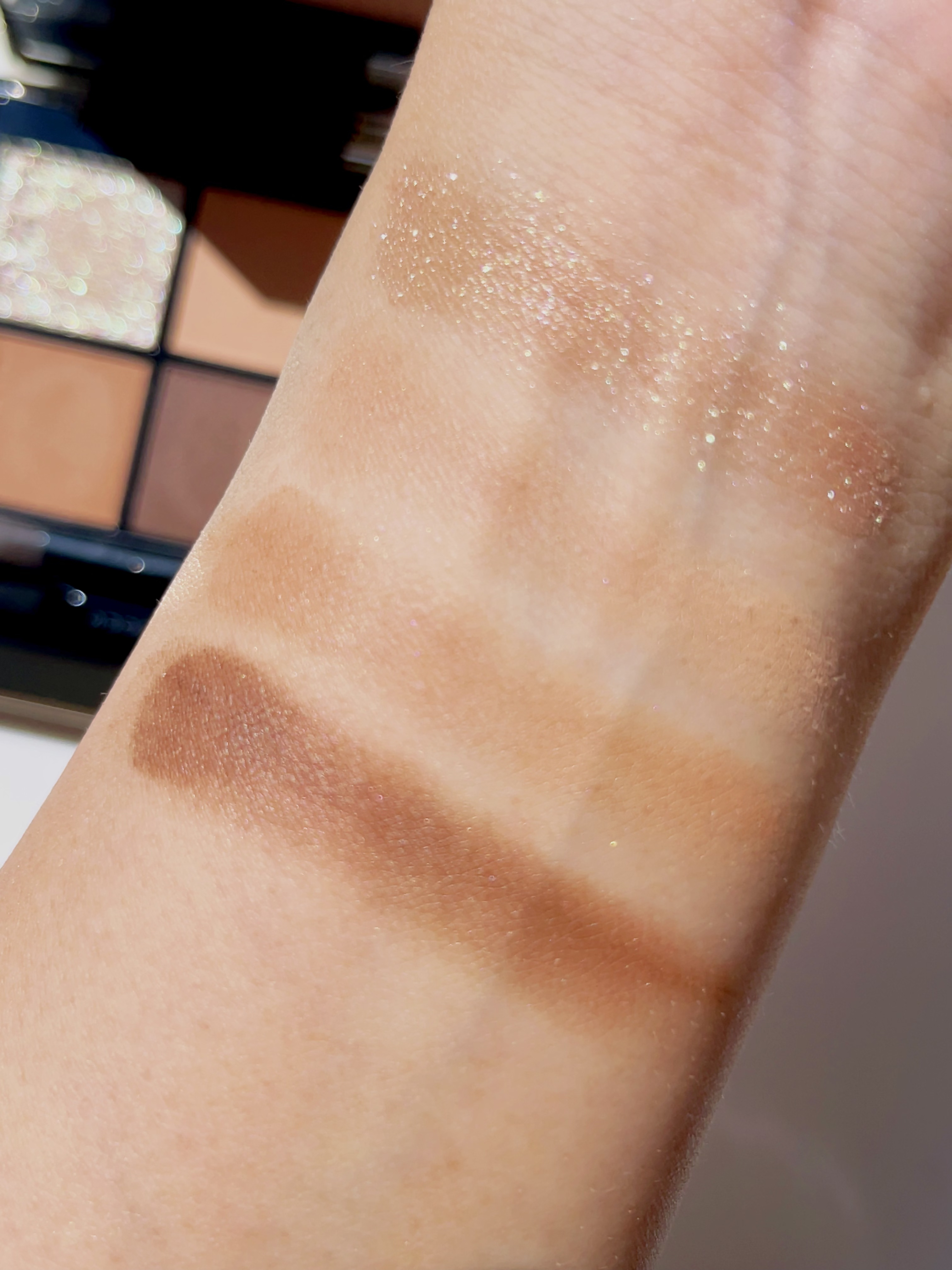 SUQQU2025WINTERCOLLECTIONS01霜落葉-SHIMOOCHIBAナチュラルブラウン×キャメルベージュ。黄みを帯びたベージュと肌なじみの良いブラウンをセットした、ナチュラルトーンのパレット仕上げに左上のゴールドカラーをひと...