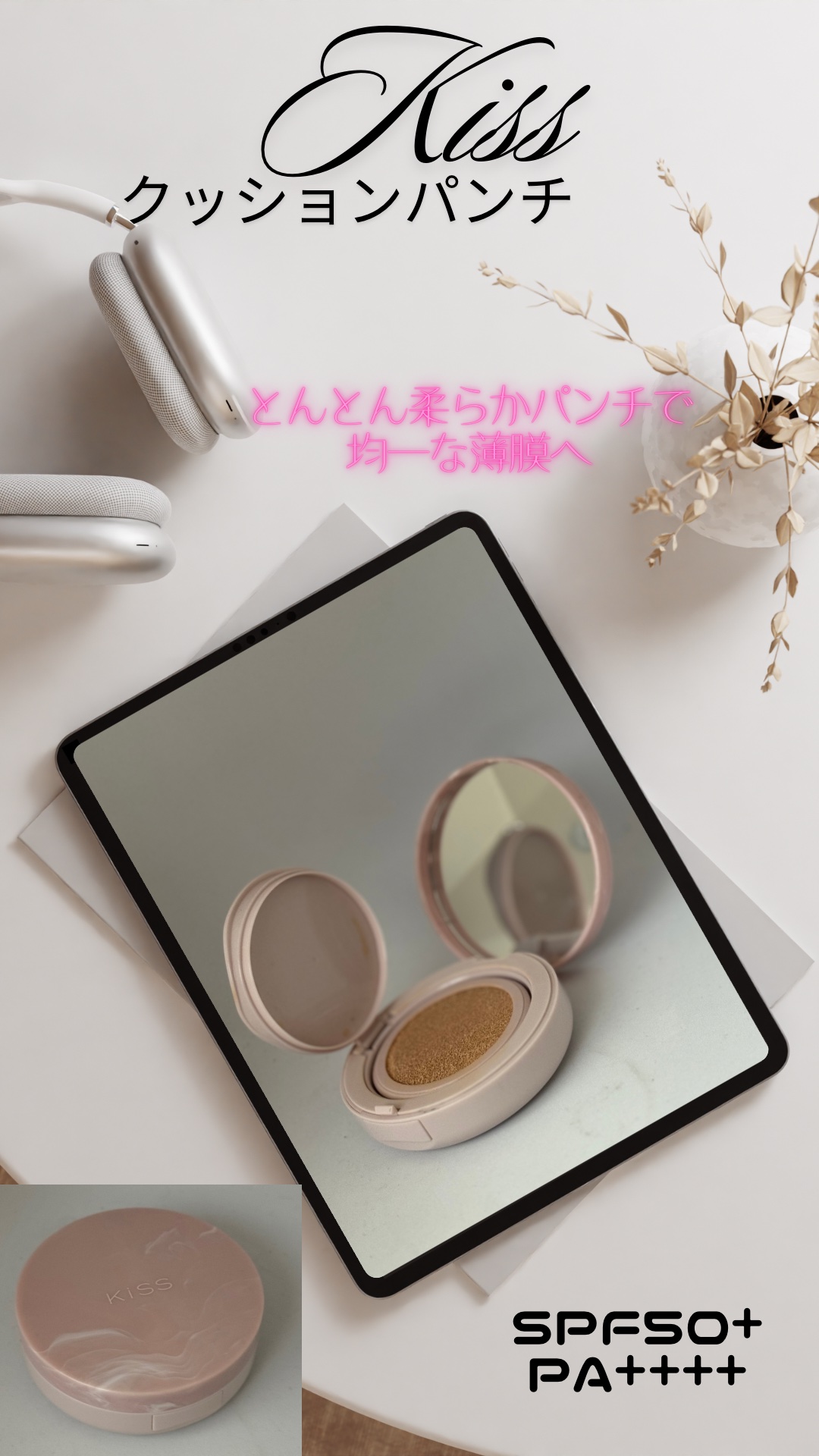 - “トントン”やわらかパンチで均一な薄膜へ すべすべ つるん美肌クッションファンデ ハイカバーなのに薄膜 ◇ソフトフォーカスパウダー・ハイカバーピグメント・カラー補正ピグメントを配合。 「薄膜」と「ハイカバー」の両立を叶えます。 たたくほど均一に伸び広がる ◇やさしくトントン叩くとやわらかく伸びて肌に隙間なく広がり、厚塗り感のない薄膜で均一な肌に仕上げます。 ◇キメ細かく、高密着でお肌の毛穴・シワ・凹凸をなめらかで均一に整えるもちふわ素材の独自パフを採用。 絶妙な厚みで肌にのせやすく、目・小鼻周りを仕上げやすいドロップ型。 長時間くずれにくい! ◇テカリや皮脂くずれを長時間防止。表情に合わせて伸縮する「シンクロフィット処方」で、シワだまりやひび割れを防いできれいな仕上がりが続きます。 トレンド感のあるほのかで上品なツヤ ◇内側から輝いているような自然なツヤを纏った肌に。 美容液成分配合 ◇ナイアシンアミド・バオバブエキス・ヒト型セラミド(うるおい成分)配合。 日常紫外線をカット SPF50+ PA++++ 先行発売 2025年2月28日(金)