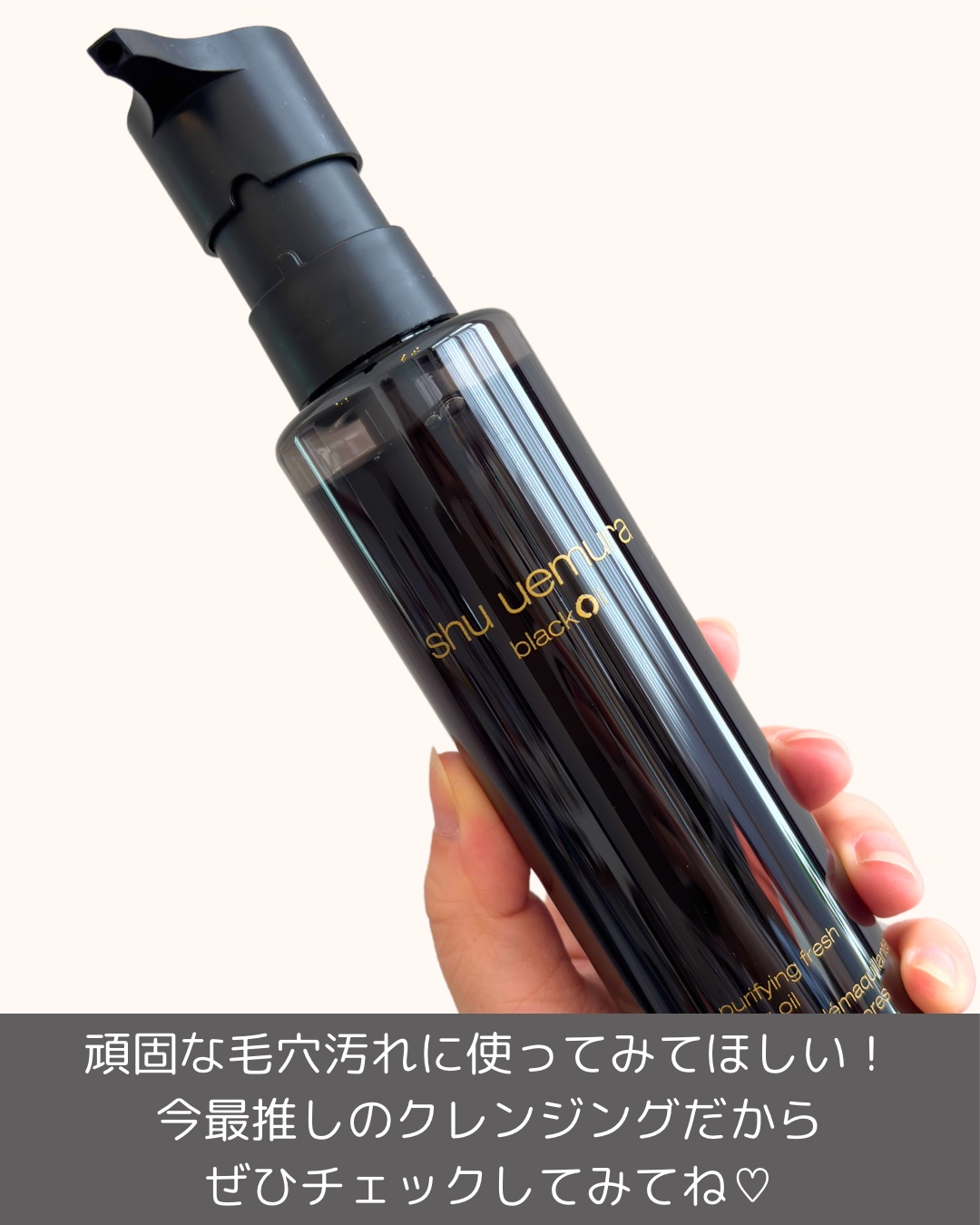 オイリー・混合肌の毛穴悩みを追求 速攻、毛穴クレンジング。 ブラックオイルで、潤いフレッシュ肌。 洗い上がりのフレッシュ感が続く。 汚れを落とすだけでなく、潤い、ハリのある、健やかな肌へ 毛穴の詰まりをオフする ブラック クレンジング オイルはshu uemuraのクレンジングの中で一番サラサラしてる。 だけど肌の馴染みが良くてメイクが馴染ませてすぐ落ちてるのが実感できた!