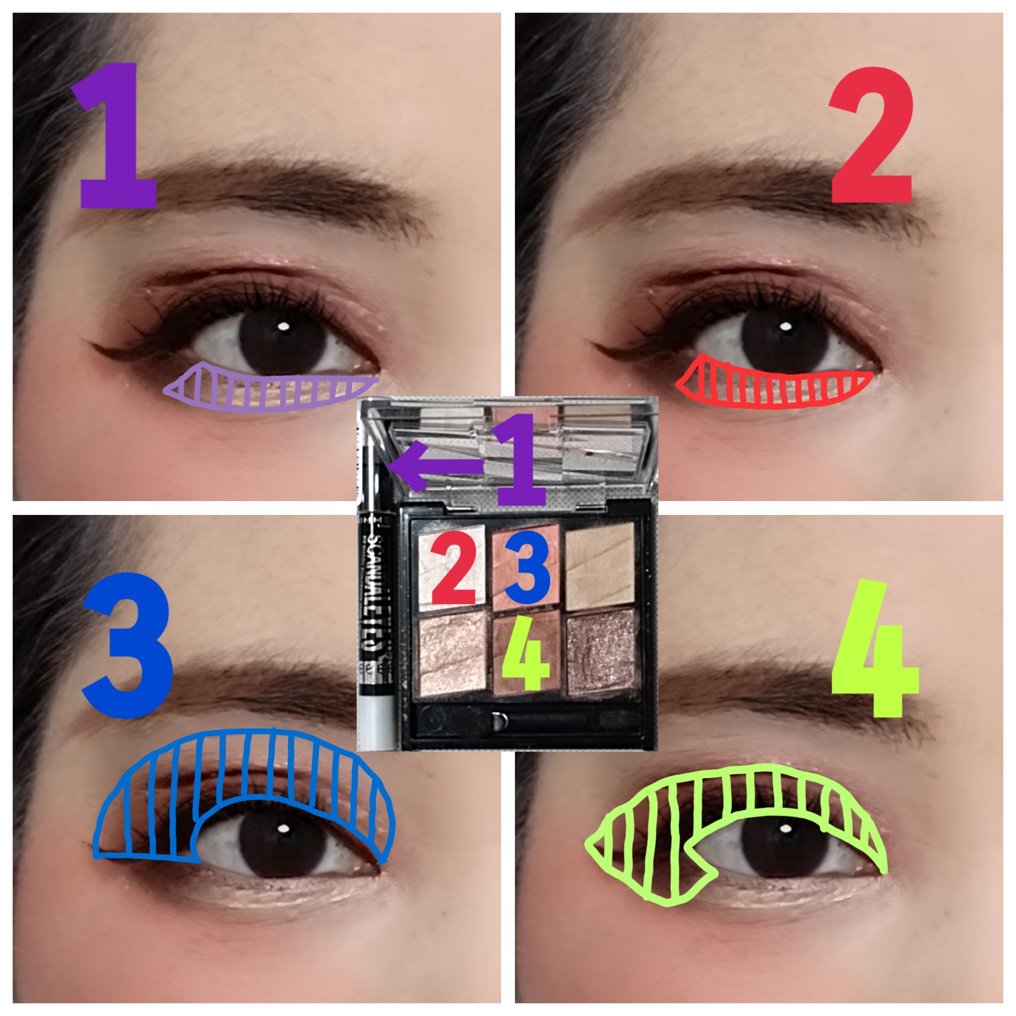 アイシャドウパレットは、URGLAM UR GLAMBLOOMING EYE COLOR PALETTE 02を、使用しました。 マスカラは、MAYBELLINE NEW YORK コロッサルボリュームエクスプレスを、まつ毛全体にまんべんなく塗ります。 リップは、wet 'n' wild MegaLast Lip Colorを、唇全体にまんべんなく塗ります。