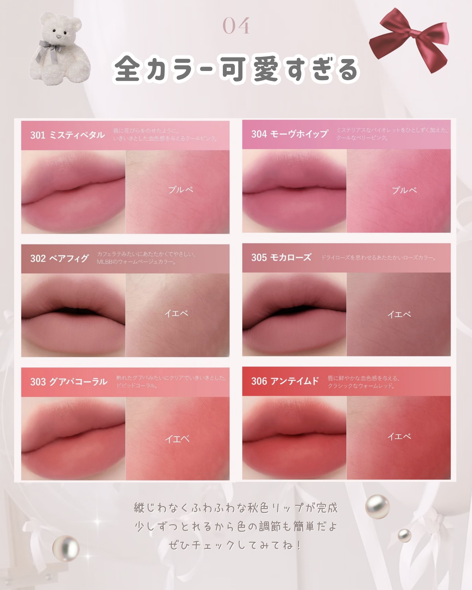 - -「ティント処方」でつけたての色をキープ。 - 少量でも唇全体がふんわりブラーリングされたような仕上がり。 - 乾燥しにくいマット質感で、角質浮きしにくいなめらかなテクスチャー。 - 無香料・パラベン不使用・動物由来成分不使用。
