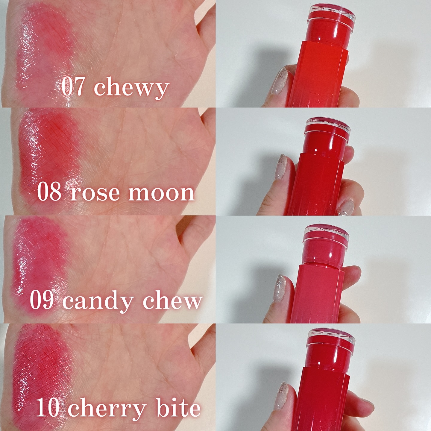 - ほんのりプランピング効果で痛くないぷっくりティント。 もっちりなのに嫌なべたつきがなく使いやすい。 縦ジワがなくなる綺麗な唇を~! ひと塗りで輝く、 澄んだ透明感あふれるぷるんとしたキャンディツヤ🍭 ティントにグロスの長所をプラスしたテクスチャーで、 ベタつかず長時間続く光沢を ✧˖*°࿐