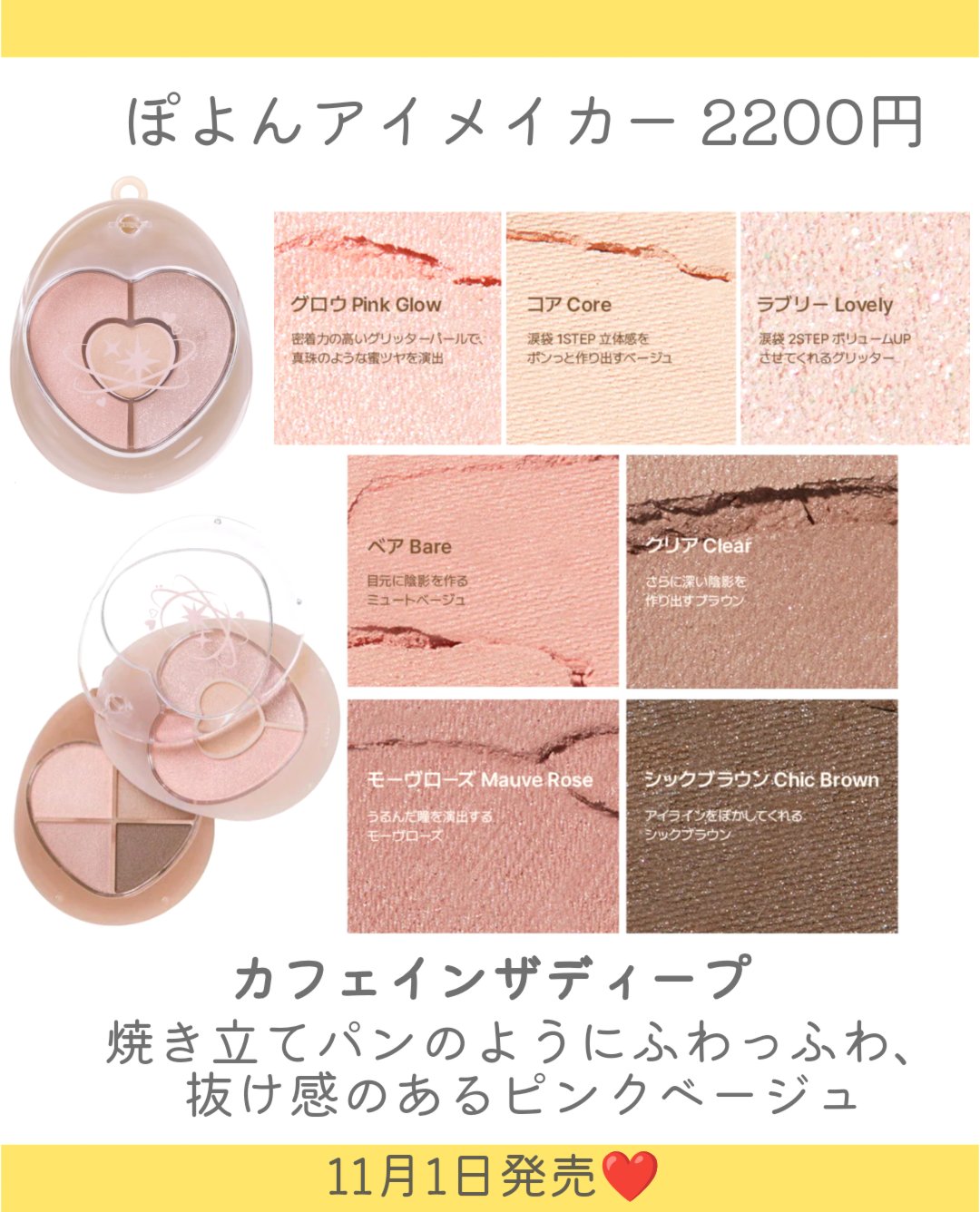 - しっとり宿る透明感* 目元に伸び広がり、なめらかに密着。 肌と一体化したような高いフィット感で、粉飛びを防ぎ濡れたようなツヤめきを放ちます。 生っぽくやわらかな質感で目元になじみ、瞬きするたびに透き通るような輝き*で、きゅるんとうるんだ目元に仕上がります。 ナチュラルに盛れる発色 ピンク、コーラル、ブラウンといずれも初心者でも使いやすいカラーで構成された7色パレット。 単色使いもグラデ使いもしやすく、さりげなく目元を大きく魅せます。 マルチユースな使い心地 ハイライターゾーンと、マットゾーンと2層にわかれたスライドタイプのアイパレット。 アイシャドウだけでなく、鼻筋や頬などのハイライターやシェーディングとしてもお使いいただけます。 スライドタイプのアイパレット ポケットやポーチに収まりやすく、付属のチェーンをつけて、バッグのアクセサリーや「チャームコスメ」としてもおすすめ。 またスライドを外し、他のカラーと組み合わせて自分だけのアイシャドウパレットとしてお使いいただくことも◎ \ぽよんとは?/ 韓国語でフォトショップしたような淡いホワイトフィルターがかかった印象のことで、淡く儚げな目元を演出することからインスピレーションを受けております。 *メイクアップ効果による 発売日: 2025年11月1日~ Qoo10日本公式ストア 2025年11月14日~順次 全国のロフト(一部店舗除く)、ロフトネットストア 2025年11月28日~順次 全国のバラエティストア、ドラッグストア(一部店舗除く) 楽天、 Amazonにて発売