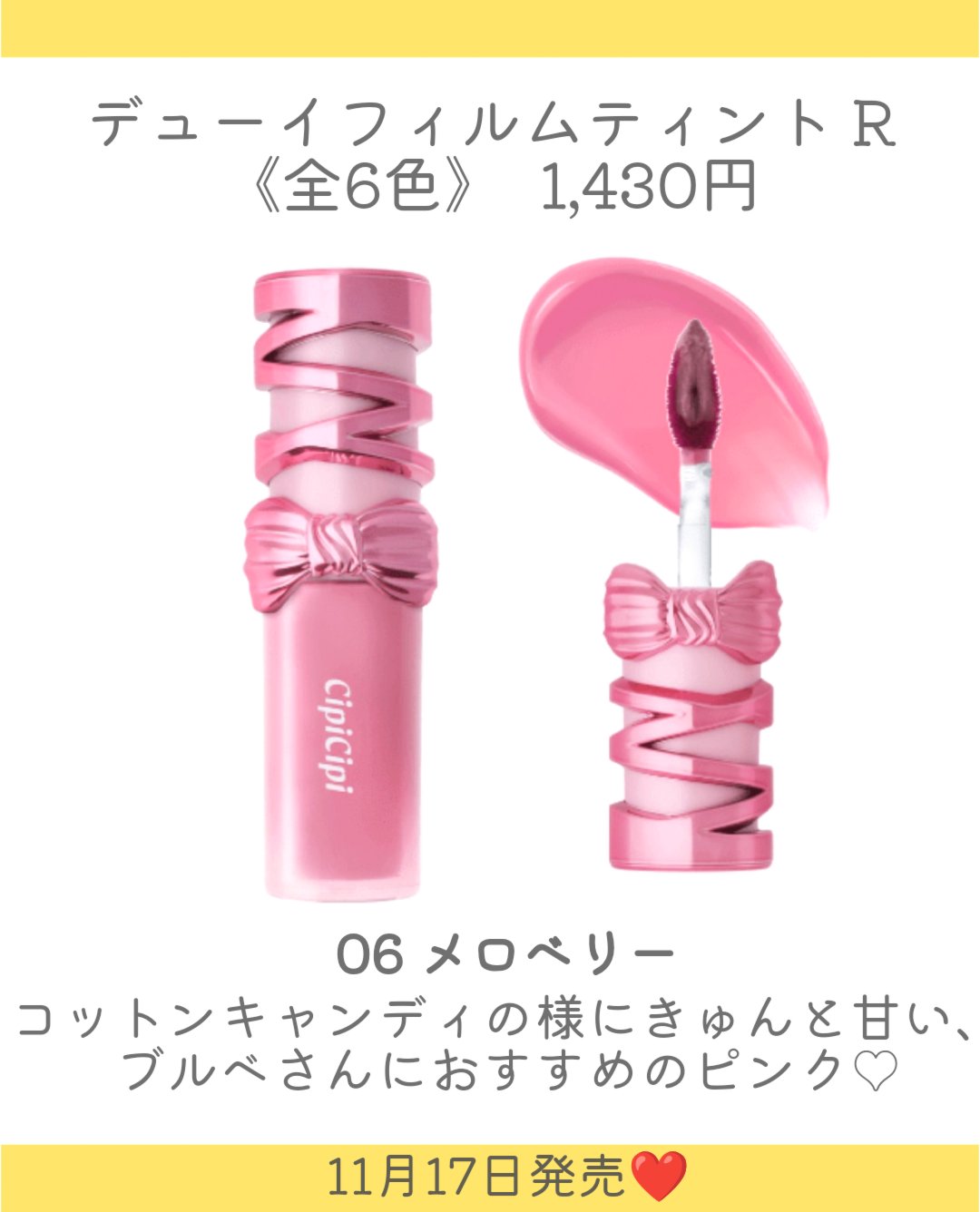 ˗ˏˋシピシピ新作速報📢リボンパケが可愛すぎる!!🐇🎀✨ˎˊ˗CipiCipiからキラキラリボンパケの新作リップが登場.ᐟ.ᐟ˚₊‧✩*。゚⋈⋈*。゚シピシピデューイフィルムティントR¥1,430(税込)🗓11月17日(月)発売*。゚⋈⋈*。...