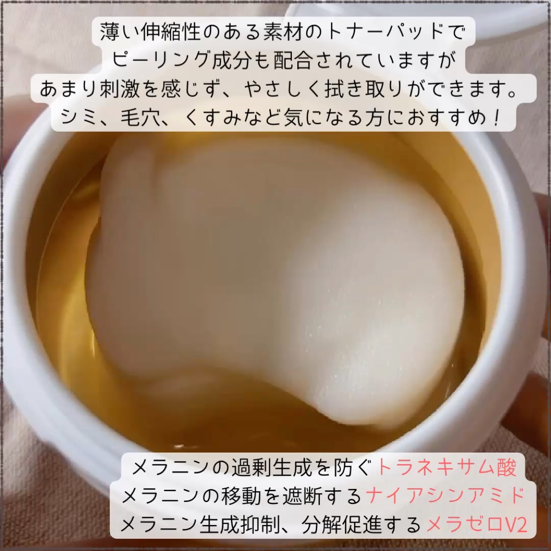 トナーパッドで肌のトーン&キメデイリーケア 1.毎日朝・晩の洗顔後、パッドで顔を軽く拭き取りください。 めちゃくちゃトナーがたっぷり。 薄くて伸縮性のあるパッド。柔らかいから肌への刺激も少なく感じる