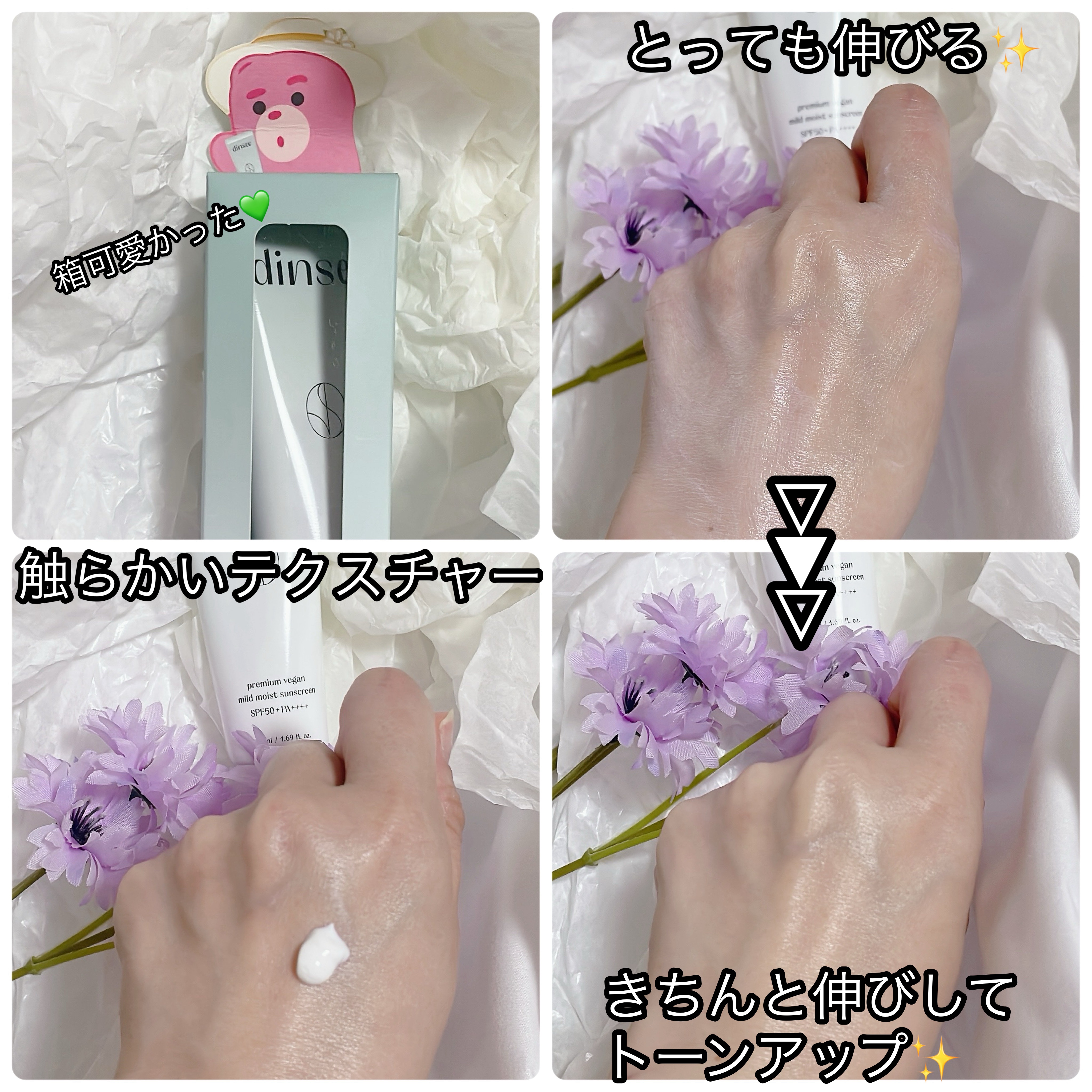 ●DINSEEプレミアムビーガンマイルド日焼け止めSPF50+PA++++プレミアムビーガン日焼け止めでやさしさも、しっかり大人肌ケアも!Dinsee(ディンシー)さんは、韓国発のビーガン&クリーンビューティーブランド。肌にも環境にも配慮した...