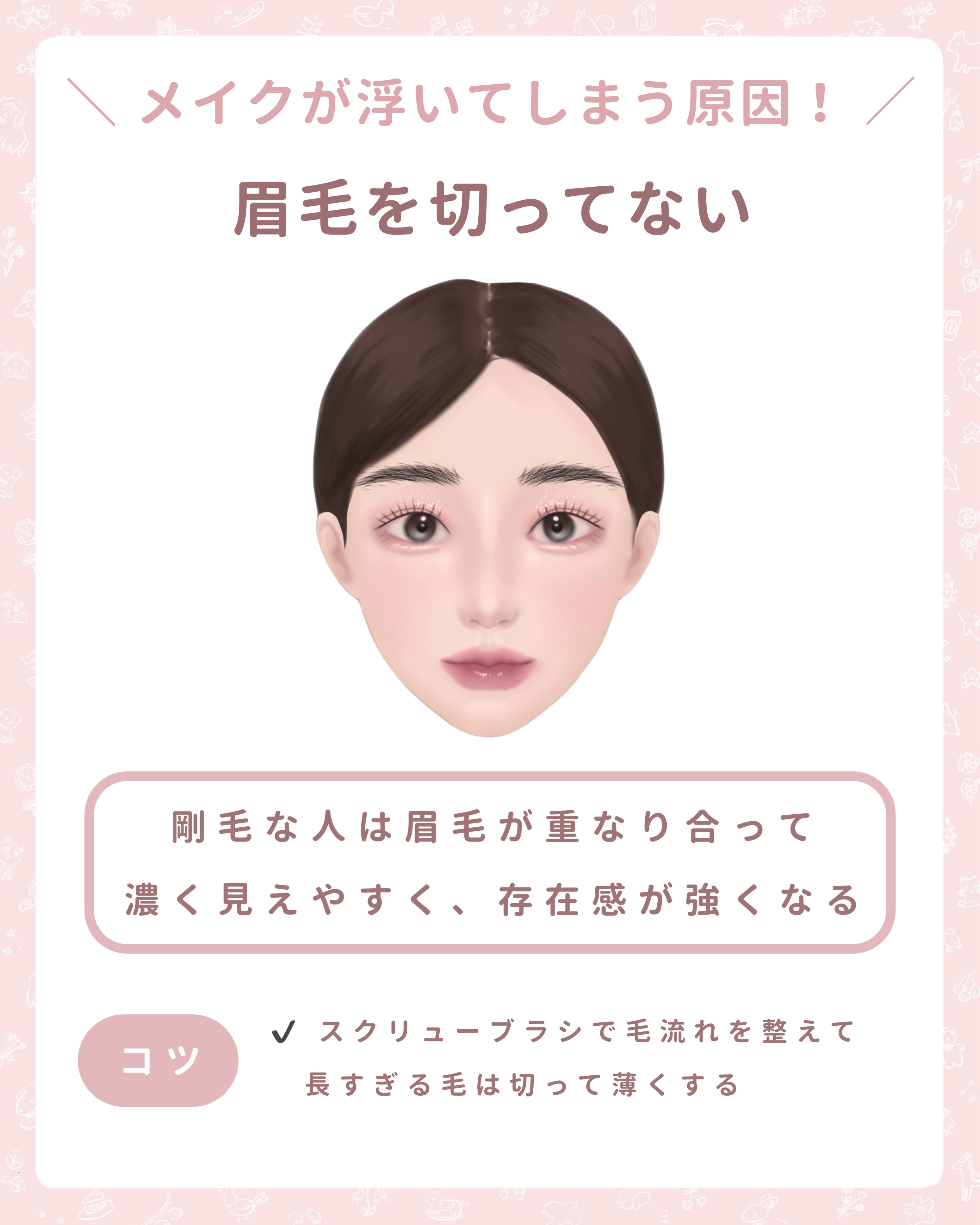 ・涙袋の影の部分まで、ベースを塗ることで縦幅がかなり強調されて丸目にみえる! ・アイシャドウの陰影とラメのハイライト効果で奥まった目に光を取り込んで出目っぽくみせる! ・淡いピンクのアイシャドウ、艶のようなラメ、細くて短いブラックアイラインが特徴 ・つり目を自然にいかせて、美人な雰囲気になれる! ・単色メイクは簡単そうに見えて難しいけど、ブラシを使うと綺麗なグラデーションになる! ・目の形によって中間色をどこまで入れるか変わるけど「目を開けた時に5mm見える」を基準にする