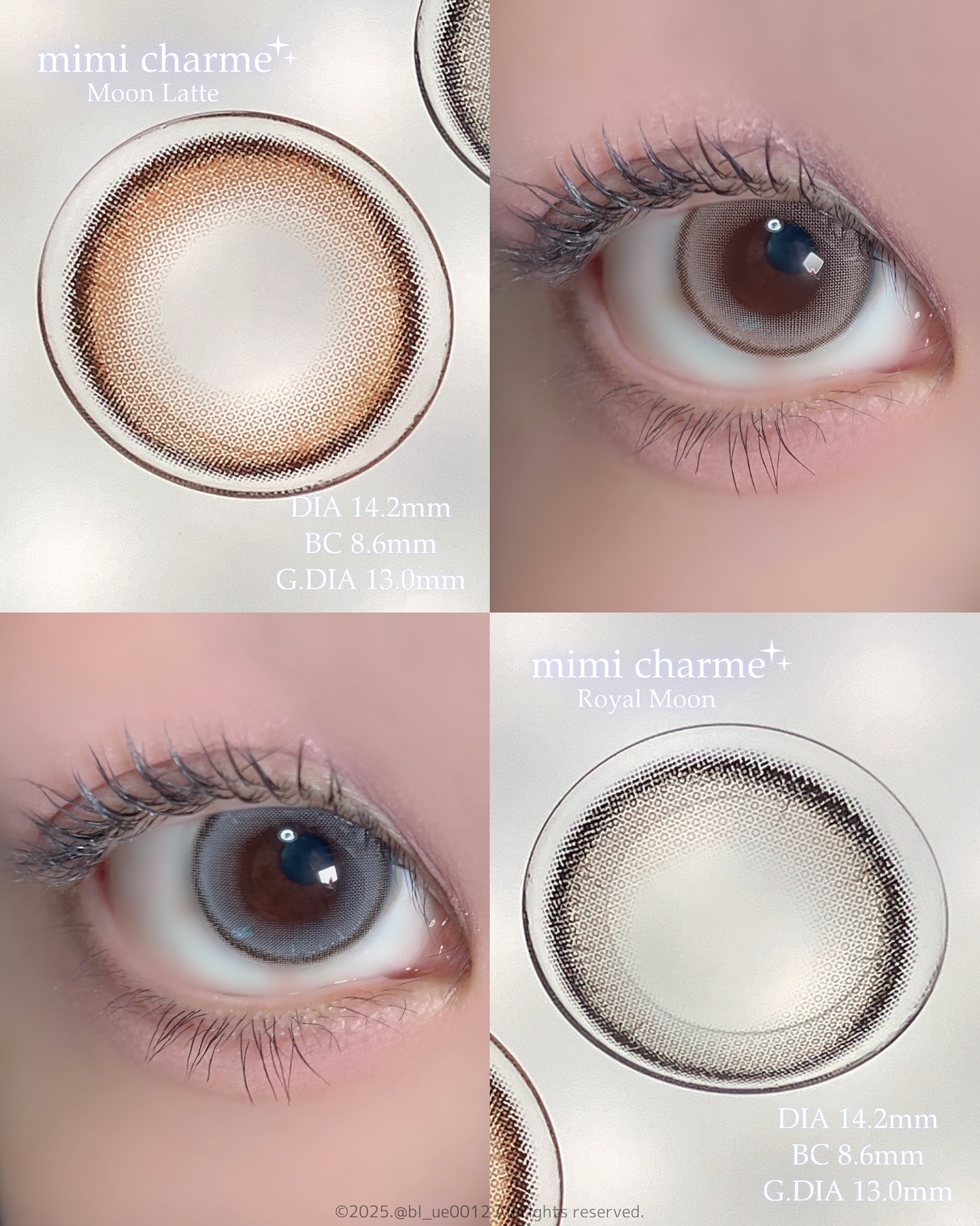 - 誰もが物語の主人公。 舞台の上でスポットライトを浴びているように瞳に魅力と光をまとわせ、毎日のわたしをより一層美しく輝かせる。 mimi charme(ミミシャルム)と一緒に物語の続きを。 <キティパフ> DIA14.2mm/着色直径13.8mm 太フチ無敵盛れ水光グレー あざと子猫ちゃんになれちゃう! 一軍太フチグレーレンズ <ジェムグレージュ> DIA14.2mm/着色直径13.5mm 細フチ大人っぽ水光グレージュ グレーなのにナチュラルでデイリー使いしやすい! <ドーリードロップ> DIA14.2mm/着色直径13.6mm 新感覚♡きゅるん盛れドーリーアイ 散りばめたブルーのハイライトがトレンド感満載! <ハニーシロップ> DIA14.2mm/着色直径13.5mm 細フチあざと水光ブラウン 新王道!垢抜け水光ブラウンレンズ <ムーンラテ> DIA14.2mm/着色直径13.0mm キラめき水光ミルキーベージュ オシャレな放射状ハイライトでまるで発光しているような瞳へ! <ロイヤルムーン> DIA14.2mm/着色直径13.0mm キラめき水光ミルキーグレー あの大人気カラームーンラテの色違い! 儚げうるみグレーレンズ カラーコンタクトレンズの不適正使用による眼障害の危険性等などがあります。 ●コンタクトレンズは高度管理医療機器です。不十分な洗浄・消毒など不適切なケアや、長時間・交換期間を超えた装用により、アレルギー性結膜炎、角膜感染症、角膜潰瘍等の重篤な眼障害が発生する危険性があります ●ご使用前に取扱説明書を確認してください 使用上の留意事項 ●眼科医院等を受診してからお求めください ●眼に異常を感じたら直ちにレンズ使用を中止し、お近くの眼科等で診察を受けてください ●医師の指示にしたがってご使用ください ●コンタクトレンズを装用する場合、自覚症状がなくても、眼科医院等での定期検査を受けてください ●レンズに不具合がある場合は使用しないでください