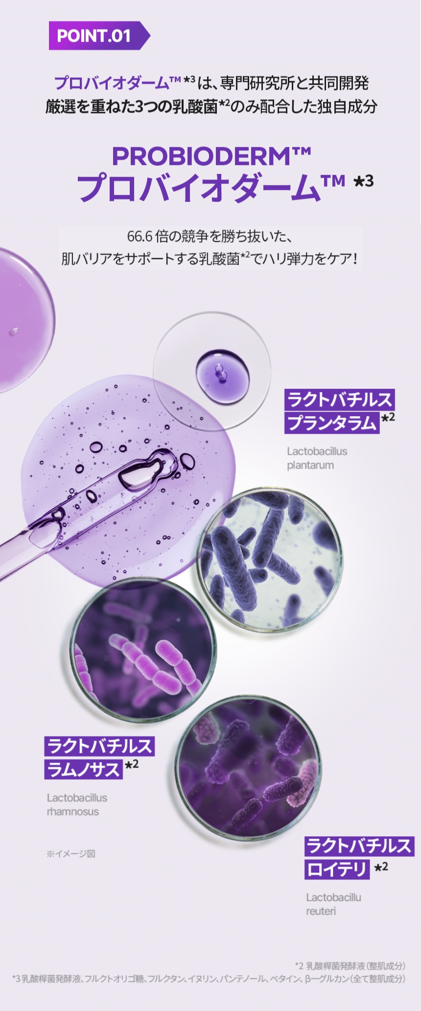- プロバイオダーム™ 3D リフティングクリーム ・既存のタンタンクリームが、より一層のハリ弾力ケアができる商品としてパワーアップ※! ★プロバイオダーム™ 3Dリフティングクリームリニューアルポイント★ ①BIOHEAL BOHが厳選した乳酸菌*のみ配合した独自保湿成分!「プロバイオダーム™」 BIOHEAL BOHの厳しい審査のもとに選び抜かれた肌バリアをサポートする独自の乳酸菌*でハリ弾力ケアを! →キーワード #ハリ活乳酸菌 *厳選した乳酸菌:ラクトバチルスプランタラム&ラクトバチルスラムノサス&ラクトバチルスロイテリ(全て保湿) ②肌本来の弾力維持に欠かせない成分をプラス!肌が持つ成分を補うことで、ふっくらうるおった肌のハリ感をキープ ③ペプチドが12種から17種に!肌バリアを形成。素肌をすこやかに保ちます。 ・もちっと密度の高いクリームで保湿&ハリケア。 バイオヒールボ独自の技術で肌表面をピンとハリをあたえ、よりハリ感が得られるテクスチャーを実現 ・3Dと訴求しているように、ふっくらうるおい感のある多面的な弾力ケアができることから、韓国語でしっかりハリのある様子を表現するタンタン(탄탄)のワードと組み合わせて「3Dタンタンシクリーム」という愛称ができました。 ・もちっと密度の高いクリームで弾力のある素肌に導くエイジングケア※2クリーム。 ※同商品リニューアル前に比べて ※2年齢に応じたケアの事
