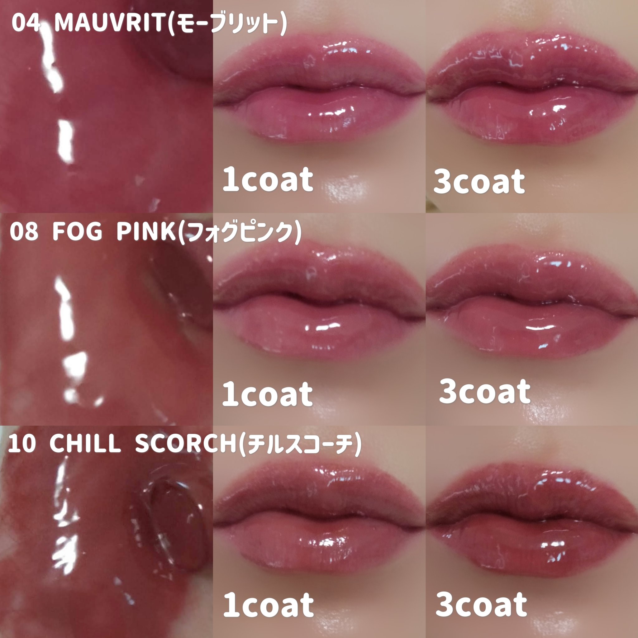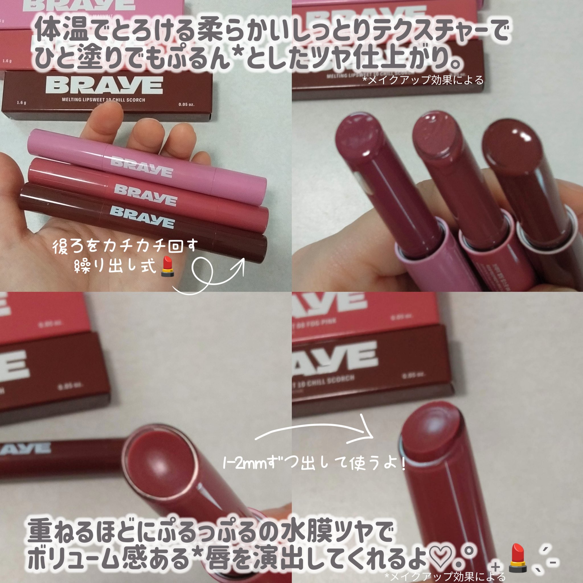 #PRBRAYEメルティングリップスウィート04モーブリット08フォグピンク10チルスコーチとろけるような塗り心地でツヤッツヤ✨スースー感、プランパー効果は控えめかな🤔💭発色良し🙆⭕️ただ色はほぼ残らないので、こまめにお直しできる日に使いた...