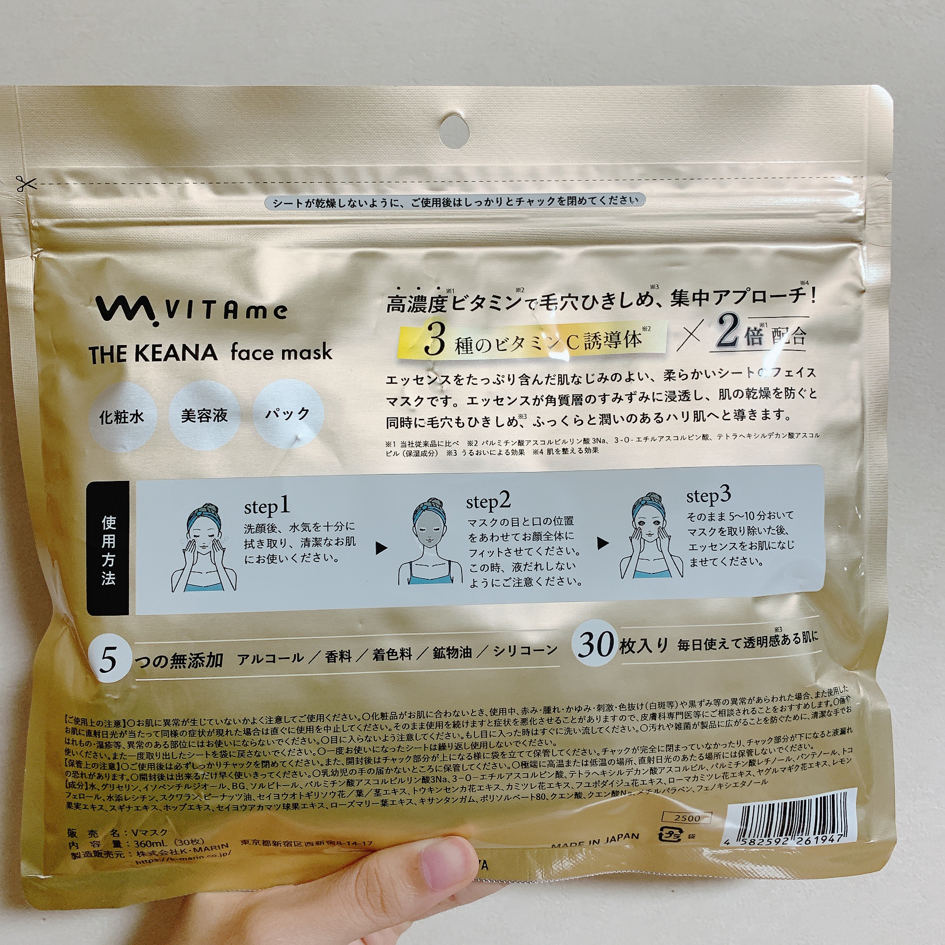 みんな大好き高濃度ビタミンC誘導体配合の美容液でひたひたになっているパックです! ビタミンC誘導体の効果は、◎ニキビのもと皮脂を抑制 ◎シミの予防 ◎毛穴がある肌の引き締め ◎ハリ・シワ対策のサポート 10分経っても十分絞れるほど美容液がひたひたで、最後にデコルテまで美容液を届けることが出来ました。 シートが厚すぎないので、途中で剥がれることなく、しっかり密着してくれました。 何よりこのキラッキラのパッケージ…テンション爆アゲです。 成分はとっても魅力的だし、コスパも最高だけど、パックの形だけが私の顔には合わず残念でした!