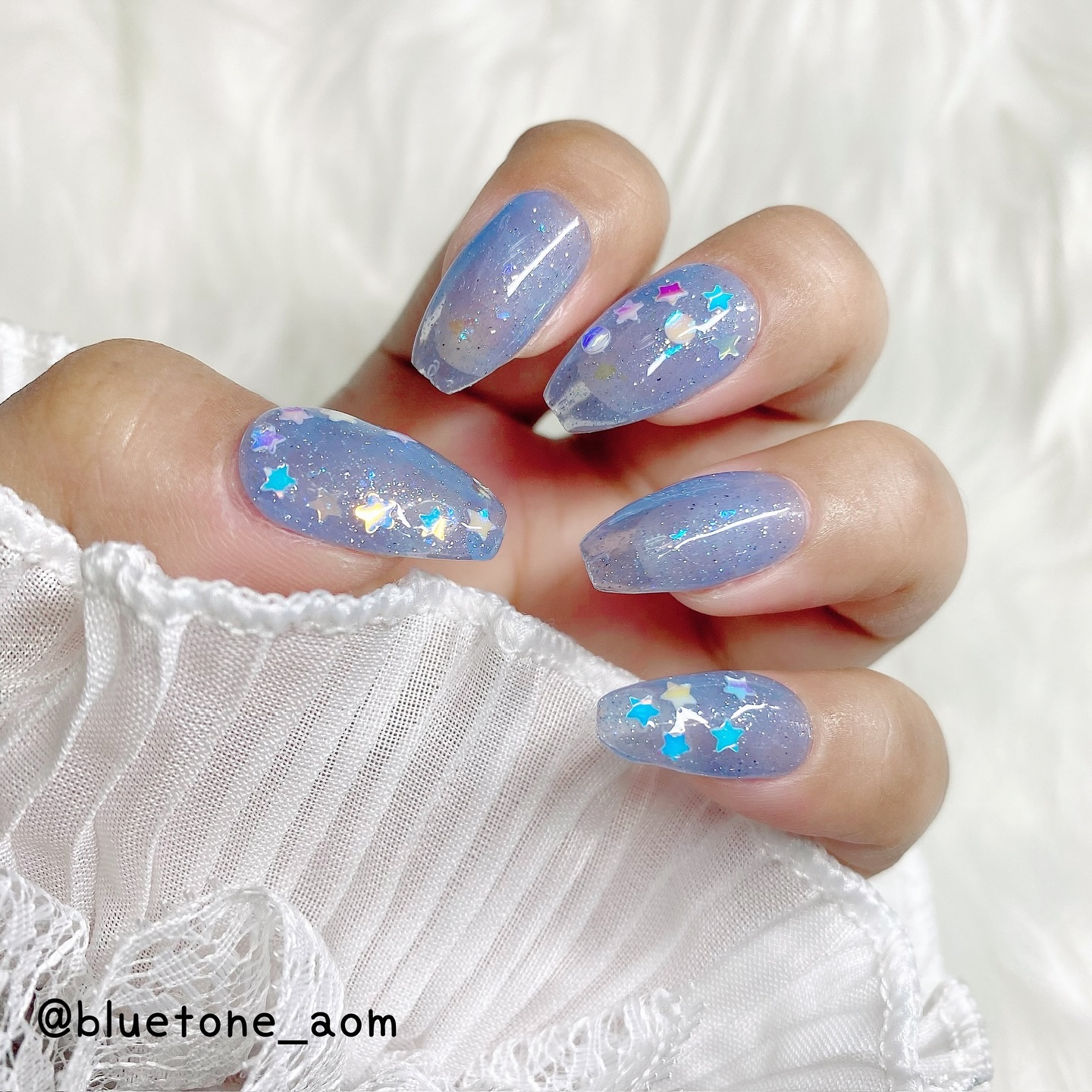 ラメがしっかりしてるし クリアカラーが入ってるから オーロラパウダー無しでも 充分キラキラしました! 反射強めのフィルムなので 実物はもっと うるうるとキラキラが強いです! ビー玉みたい🥺 ネイルシール長持ちさせたいけど ちょっと飽きてきたな〜って時とかに 全然違った印象になるのでオススメです! Seriaのベースジェル 本当にうるうるネイルしやすいので オススメしたい🙆♀️