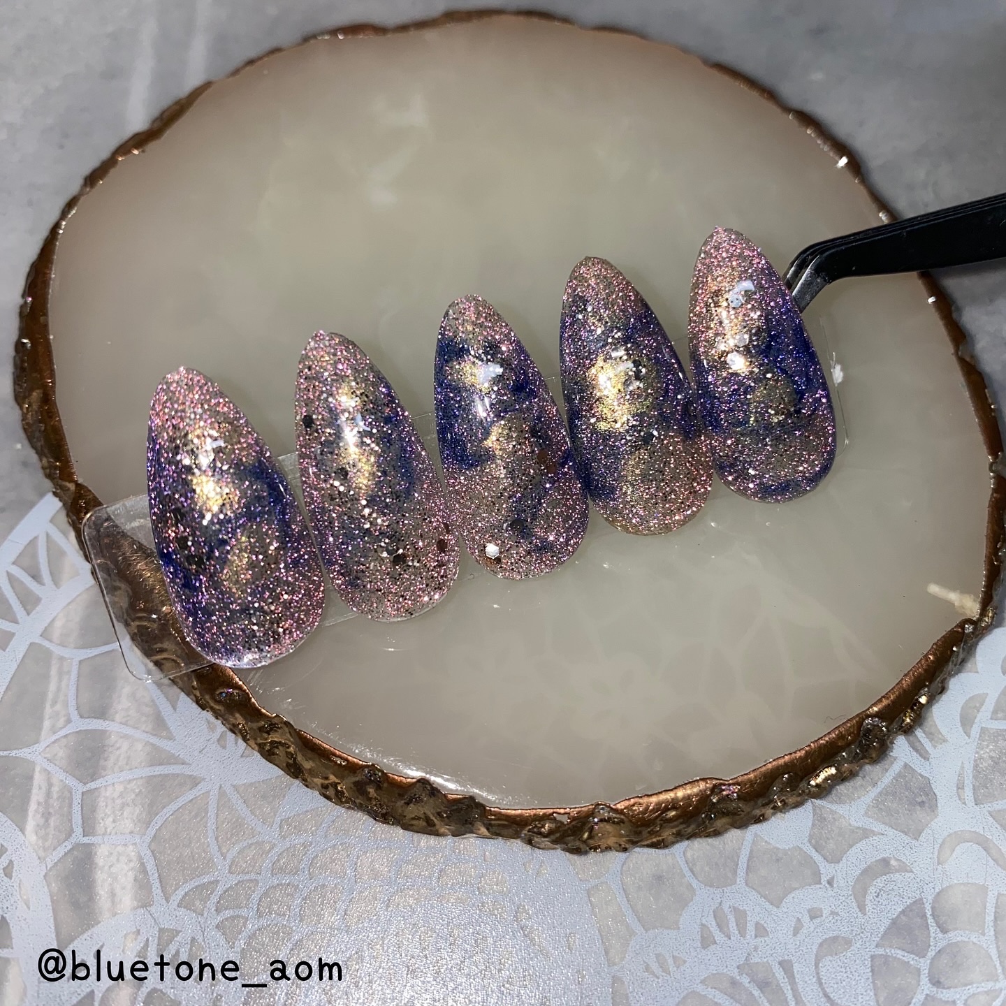 ラメがしっかりしてるし クリアカラーが入ってるから オーロラパウダー無しでも 充分キラキラしました! 反射強めのフィルムなので 実物はもっと うるうるとキラキラが強いです! ビー玉みたい🥺 ネイルシール長持ちさせたいけど ちょっと飽きてきたな〜って時とかに 全然違った印象になるのでオススメです! Seriaのベースジェル 本当にうるうるネイルしやすいので オススメしたい🙆♀️