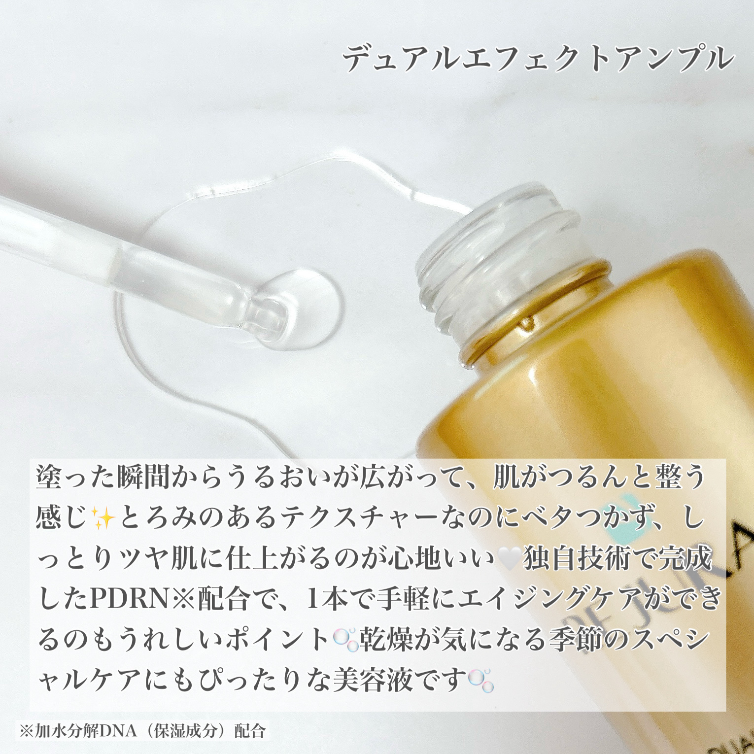 ✴︎REJURANCOSMETICSデュアルエフェクトアンプルリジュランの独自技術で完成したオリジナルPDRN*を配合したデュアルエフェクトアンプル。家で手軽にPDRNケアができるアイテムです。とろみのあるテクスチャーの美容液がうるおいを与え...