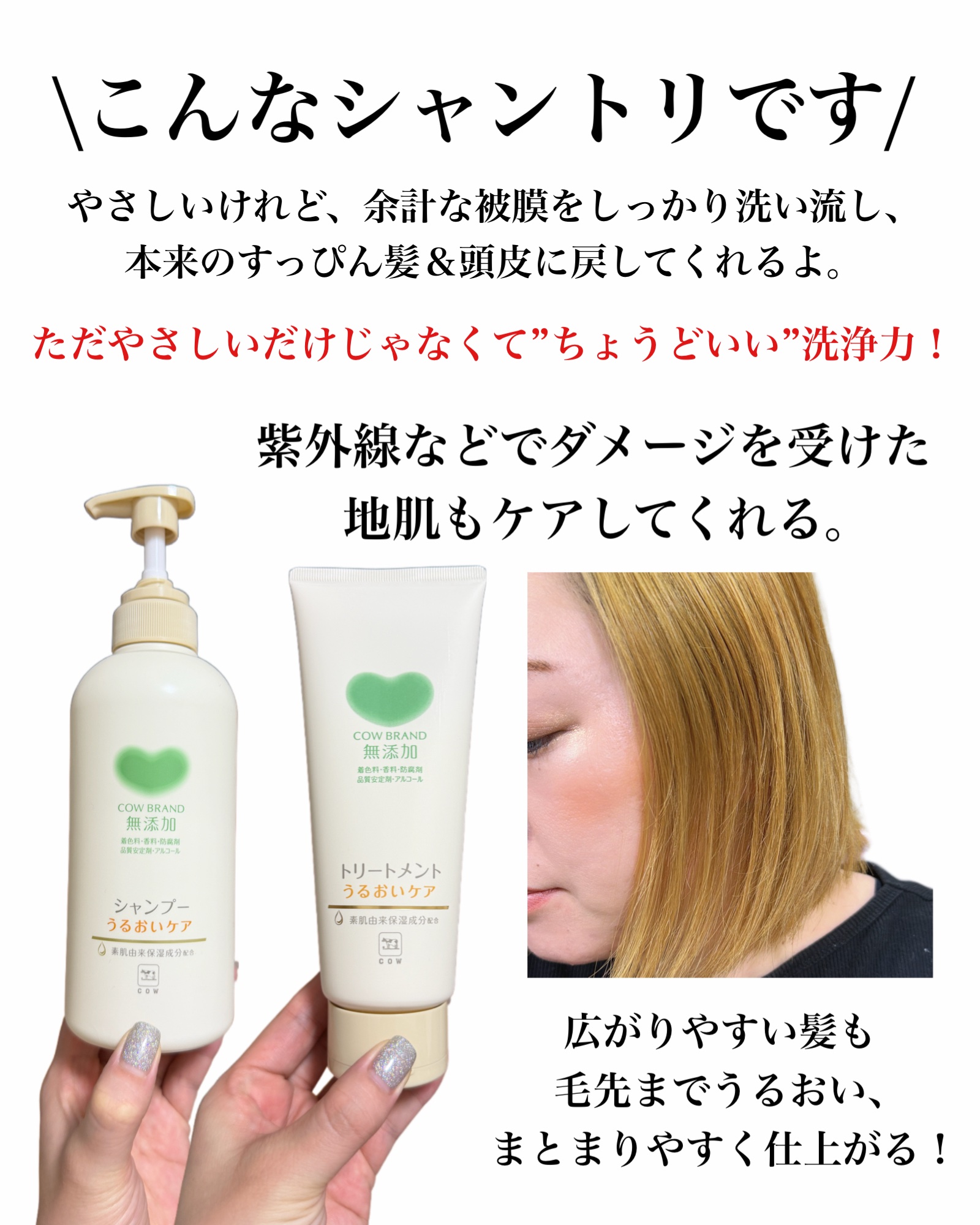 \無添加ヘアケア/すっぴん美髪♡………………………………□カウブランド無添加シャンプーさらさらケア470g1,100円(税込)無添加トリートメントさらさらケア180g770円(税込)………………………………メイク落としミルクや洗顔がSNSでバ...