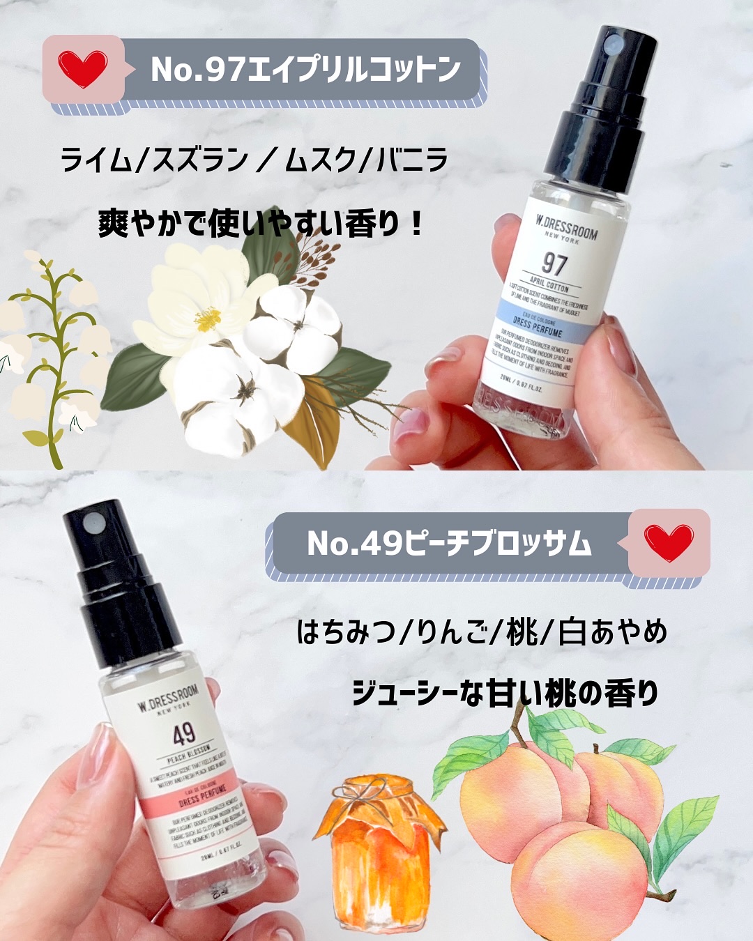 *-*-*-*-*-*-*-*♡♡♡ダブルドレスルームドレス&リビングクリーンパフュームNo.49 ピーチブロッサムNo.97 エイプリルコットン1級調香師が厳選したプレミアム香料を使用したパフューム⭐️シュッとかけるだけで24時間かおり長続...