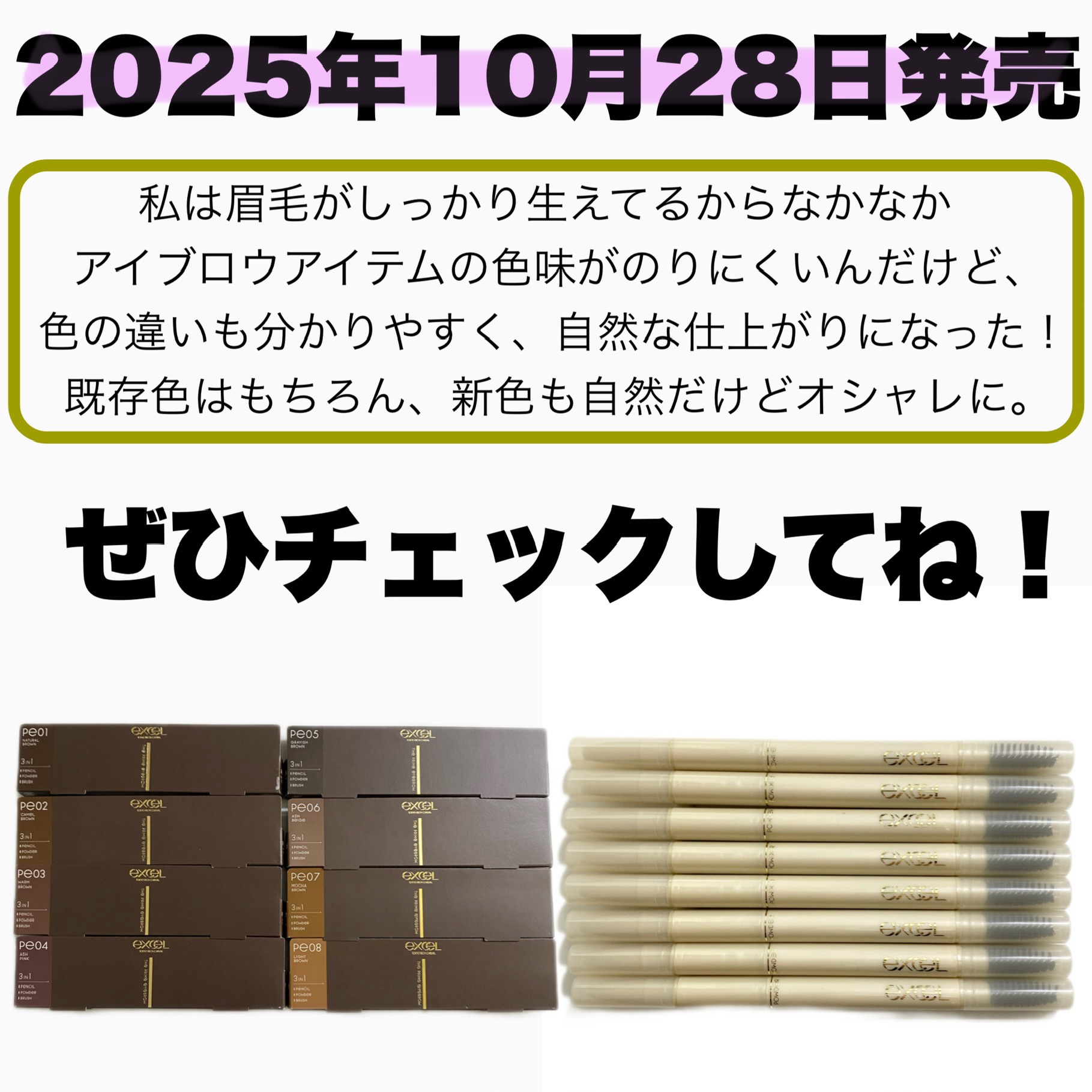 - リニューアル発売 1本で洗練された美しい眉へ ペンシル・パウダー・ブラシの3機能一体型アイブロウ 1 なめらかな描き心地と自然な仕上がりを追求。作り込んだような美しい洗練眉に。 ●ペンシル 隙間埋めや繊細ラインも自在に描ける楕円芯。眉尻まで1本1本細く描き足せます。 \パワーアップポイント/ ・なめらかさアップ!抜群の描き心地を叶えました。さらにウォータープルーフ処方に。 ●パウダー 濃淡がつけやすいナチュラルフィットパウダー。微細パールinで立体感を演出します。 \パワーアップポイント/ 新処方でふんわり感アップ!より自然に仕上がります。 ●ブラシ とかせてぼかせる立体スクリューブラシ。コシと肌あたりのやさしさを両立した使い心地です。 \パワーアップポイント/ コシを柔らかくし、肌あたり・使い心地アップ!よりぼかしやすくなりました。 ・さらに落ちにくくパワーアップ!美しい仕上がりが長時間つづきます。 ・毎日のメイクに嬉しい美容液成分 in ◆2025年10月14日よりエクセル公式オンラインショップ及び Amazon にて先行販売