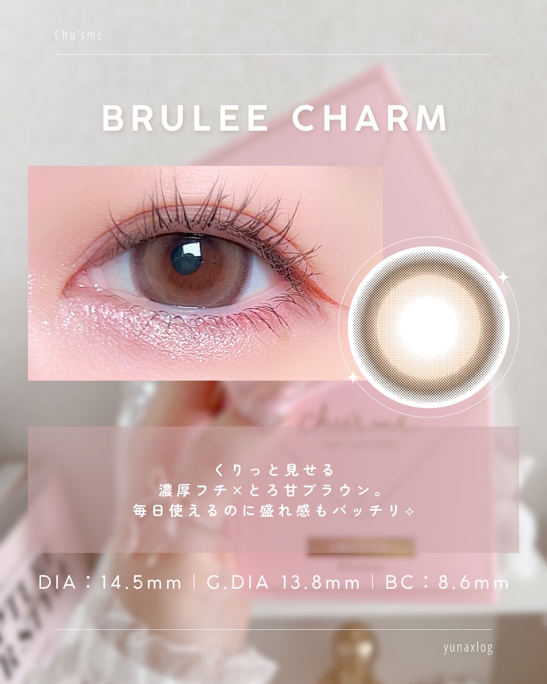 - ※2025年10月中旬より、商品パッケージ順次リニューアル。(レンズスペック・その他情報は変更ございません)尚、パッケージリニューアルに伴う商品の返品・交換は承っておりません。 まるでティントで染めたように色づく、こだわりの「あざと盛れレンズ」が登場 細すぎず、太すぎない絶妙なちゅるんフチとジューシーな色めくティントカラーで、こだわりのあざと盛れレンズがマンスリー限定色としてラインナップに加わりました。 近年ではカラーコンタクトを選ぶときにパーソナルカラーを重視するというユーザーからの意見を参考に商品開発を行い、イエベさんにはつやめく甘みベージュのメロウキャメル、ブルべさんには色っぽさ溢れるミューテッドグレージュがそれぞれの魅力を引き立てるカラーとなっております。 お好きなスタイルやメイクに合わせてお楽しみください。 ●BABY BROWN(ベイビーブラウン) 赤ちゃんの瞳のような透明感演出。ピュアな裸眼系ブラウン。 ●PEACH BROWN(ピーチブラウン) じゅわっと溶け込むように馴染む、あざとピンクブラウン。 ●HONEY BEIGE(ハニーベージュ) 透明感があふれだす、儚げラテベージュ。 ●CHIFFON BROWN(シフォンブラウン) アンニュイな透け感がポイント。ふわっと色素薄い系ブラウン。 ●MOIST BROWN(モイストブラウン) 茶フチが演出する”うるおい”感。甘え上手なちゅるんブラウン。 ●MELLOW CAMEL(メロウキャメル) ちゅるんとしたティントカラーに惹き込まれる 甘ツヤうぶベージュ。 ●MUTED GREIGE(ミューテッドグレージュ) 透明感たっぷりのくすみカラーで 仕上げる色っぽグレージュ。 ●BRULEE CHARM(ブリュレチャーム) 瞳をくりっと見せる濃厚フチ、溶け込むとろ甘焦がしブラウン。 ●BABY MORE(ベイビーモア) ベイビーブラウンのサイズアップ♡ もっとちゅるんと盛れ感をプラス、愛されモテブラウン。 カラーコンタクトレンズの不適正使用による眼障害の危険性等などがあります。 ●コンタクトレンズは高度管理医療機器です。不十分な洗浄・消毒など不適切なケアや、長時間・交換期間を超えた装用により、アレルギー性結膜炎、角膜感染症、角膜潰瘍等の重篤な眼障害が発生する危険性があります ●ご使用前に取扱説明書を確認してください 使用上の留意事項 ●眼科医院等を受診してからお求めください ●眼に異常を感じたら直ちにレンズ使用を中止し、お近くの眼科等で診察を受けてください ●医師の指示にしたがってご使用ください ●コンタクトレンズを装用する場合、自覚症状がなくても、眼科医院等での定期検査を受けてください ●レンズに不具合がある場合は使用しないでください