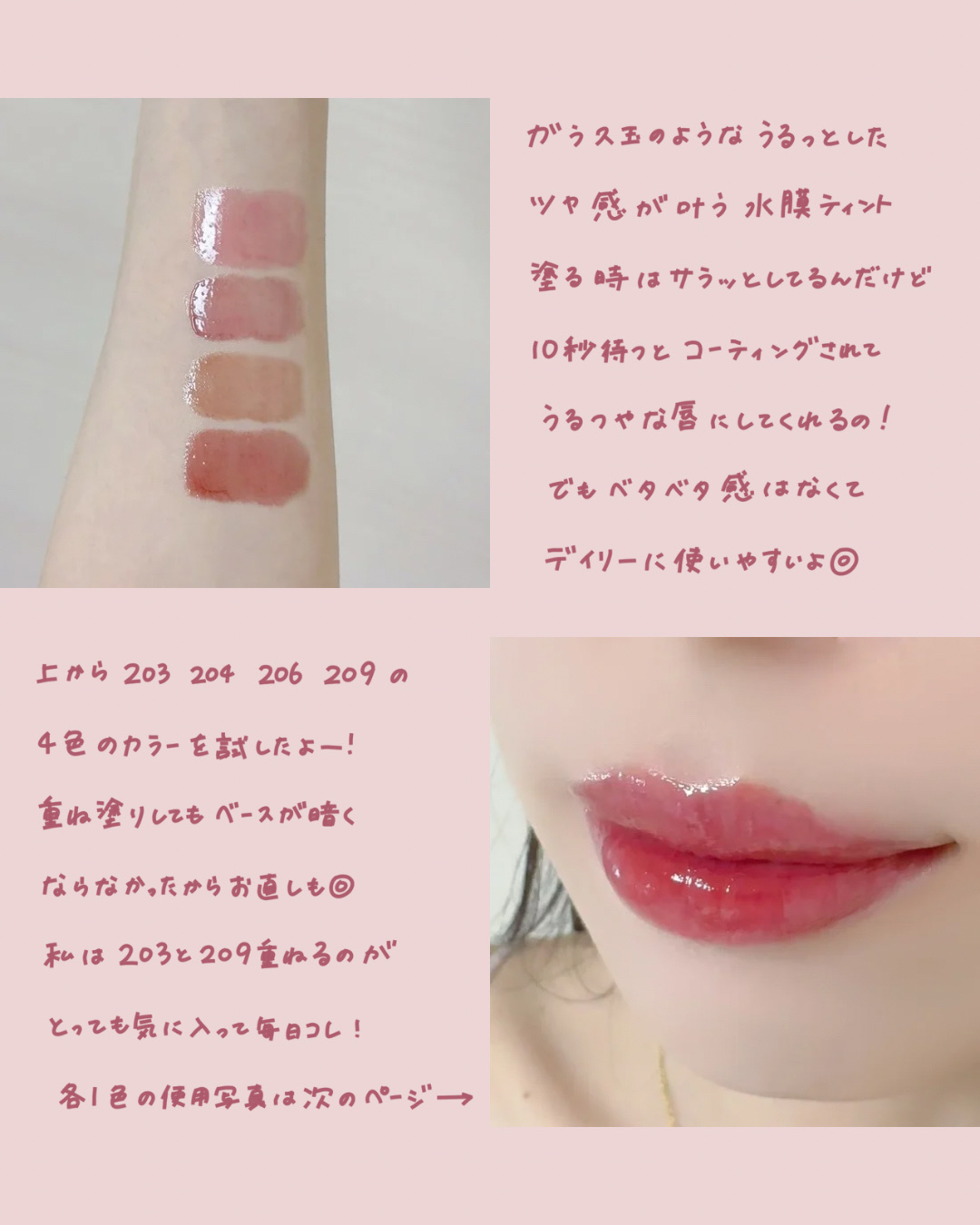 - - 「ティント処方」でつけたての色をキープ。 - まるで露をまとったような水膜ツヤ仕上げ。 - 美容オイル配合でうるおい感が続く。 - 無香料・パラベン不使用・動物由来成分不使用。