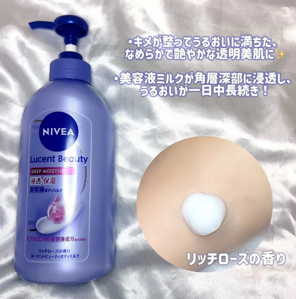 - うるおって透明感あふれる美肌へ導く、高保湿美容液ボディミルクシリーズ。 ニベアが考えるボディの美肌の鍵「キメ・つや・なめらかさ」にアプローチ。 うるおいに満ちて透明感のある肌に導く。ヒアルロン4G美容液成分※1 配合(保湿) キメが整ってなめらかで艶やかなうるおい透明美肌に。美容液ミルクが角層深部に浸透し、うるおいが長続き。 浸透ヒアルロン成分配合:浸透型※2ヒアルロン酸※3、グリセリン(すべて保湿) 気分満たされる、華やかで上質なリッチローズの香り ※1 ヒアルロン酸Na、グリセリン、グリコーゲン、グリセリルグルコシド、グルコサミン ※2 角層まで ※3 加水分解ヒアルロン酸