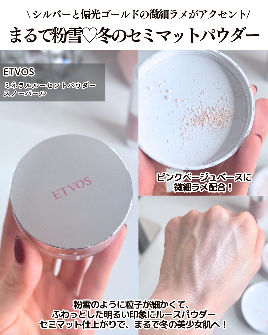 - 【2025クリスマスコフレ】 限定発売 まばたきのたび、やわらかなピンクの中に、きらっとシルバーの光が交差する。 淡くも凛とした輝きが、特別なひとときを紡ぐホリデーコフレ。 素肌に溶け込む、きゅんと愛しいピンクカラーのスキンケアベース。 まるで粉雪のように、ふんわりと軽やかなつけ心地のフェイスパウダー。 冬の空気を閉じ込めたような、澄んだ瞬きをまとう繊細な アイシーピンクパレットに、唇に繊細な輝きを添える、きらめくルージュ。 特別なシーズンのためのベース&ポイントメイクを贅沢に詰め込んだ、 限定コフレボックス。 不使用成分 | アルコール・パラベン・石油系界面活性剤・鉱物油・シリコン・ タール系色素・合成香料・紫外線吸収剤※ ※紫外線防御効果があるのはミネラルインナートリートメントベースのみ <セット内容> ・ミネラルクラッシィシャドー クワイエットグラム ・ミネラルインナートリートメントベース マカロンピンク SPF31 PA+++ ・ミネラルルーセントパウダー スノーパール ・ミネラルシアールージュ フローズンピンク 予約日:10月8日(水)~11月4日(火)※直営店舗にて予約受付。 発売日:2025年11月5日(水) ※エトヴォス公式オンラインストアでは、10月8日(水)10:00~10月29日(水)10:00まで予約受付。 ※予約限定特典として、ピンクのファーポーチが付属。