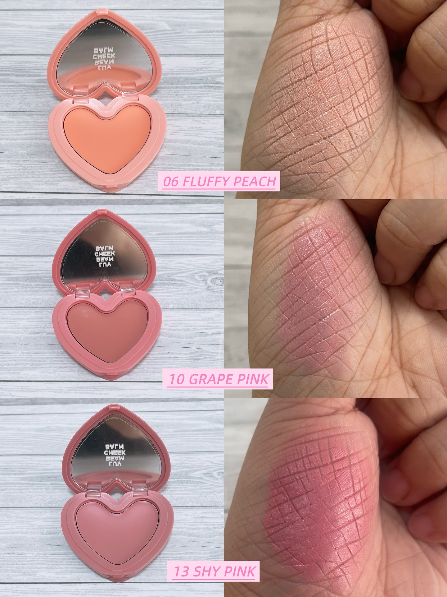 【ラブビームチークバーム】♡01PURECORAL♡02INNOCENTPINK♡03MOODROSE♡05CHEEKYLAVENDER♡06FLUFFYPEACH♡10GRAPEPINKL♡13SHYPINKまず、パケがハートなのが可愛すぎ...