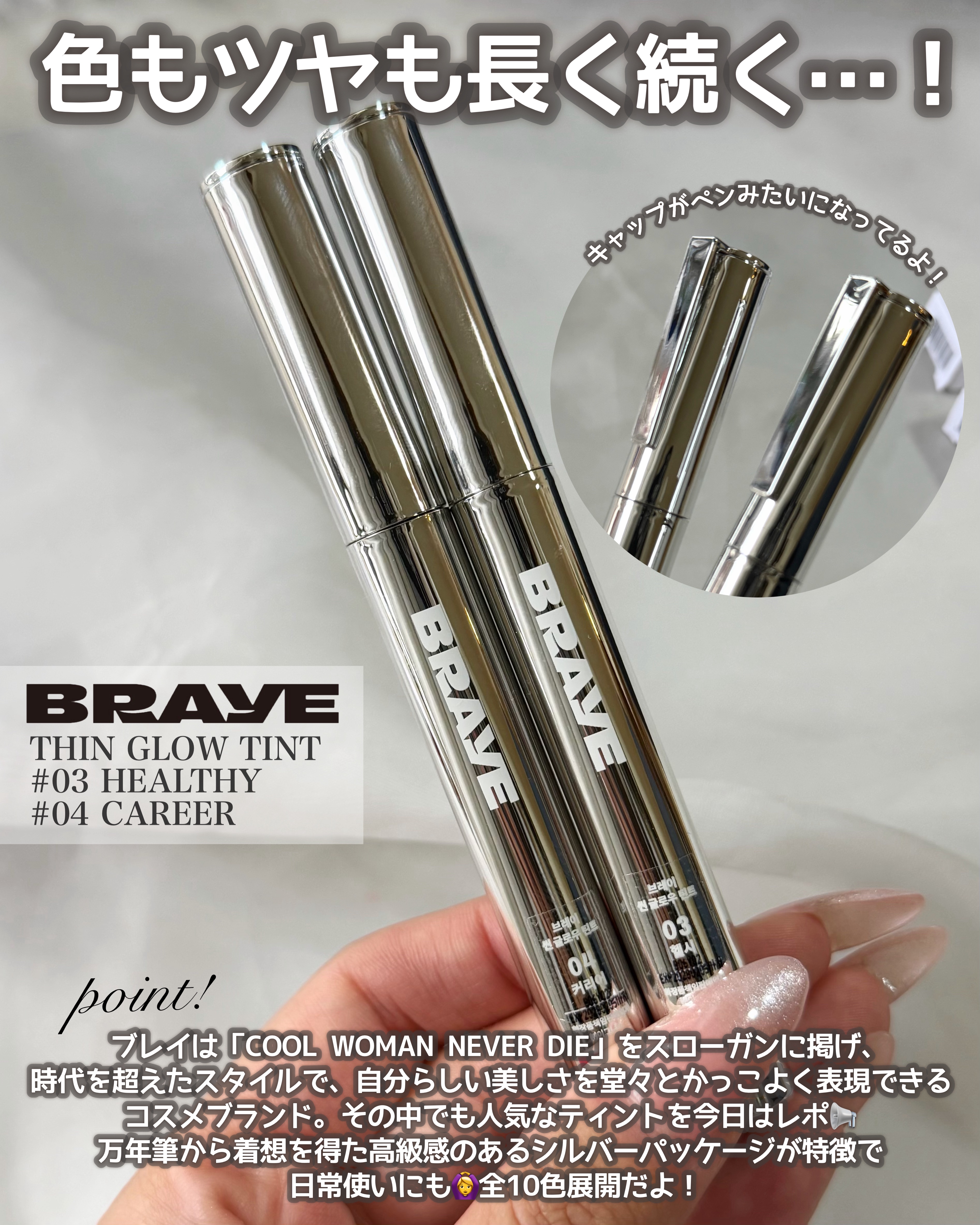 飲み会リップ🥀BRAYETHINGLOWTINT色持ちがいいうるツヤティント🫧万年筆から着想を得た高級感のあるシルバーパッケージ日常使いにも、色んなスタイルにマッチするカラー全10色展開みずみずしい使用感で見たまま発色♡飲み会リップと言われる...