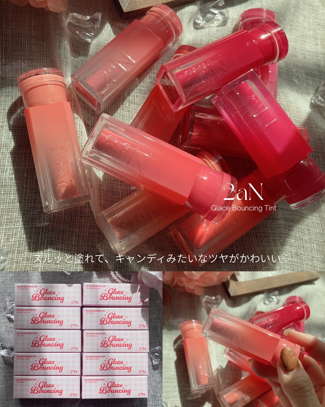 2aNグレイズバウンシングティントは、唇の上に溶け込みクリアなツヤをキープ!さらにプランピング効果でぷるんと、まるでキャンディリップ🍬🤍プランピング効果は刺激はなくス〜っとする感じ✨シーンや気分に合わせて、重ね塗りで発色UPや2色をレイヤリン...