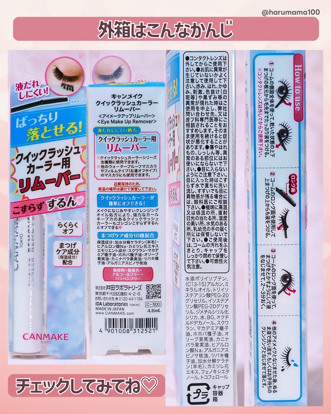 - こすらずするんと落とせる! カールキープの強いクイックラッシュカーラーを落とす用のリムーバー。 メイクになじみやすいクレンジングオイル処方により、こすらずするんとオフできます。 クイックラッシュカーラー全種はもちろん、 他のウォータープルーフ(油性タイプ)のマスカラにも使用できます。 旧コームに比べてコームの間隔が広くなったため、 まつげに引っかからずに塗りやすい♪ また、旧処方からオイルゲル化剤を2種類追加し 「塗る時やメイクとなじませる時はするする~と伸びるのに、 まつげに塗った後はピタッ!と留まって垂れにくい」を叶えました!