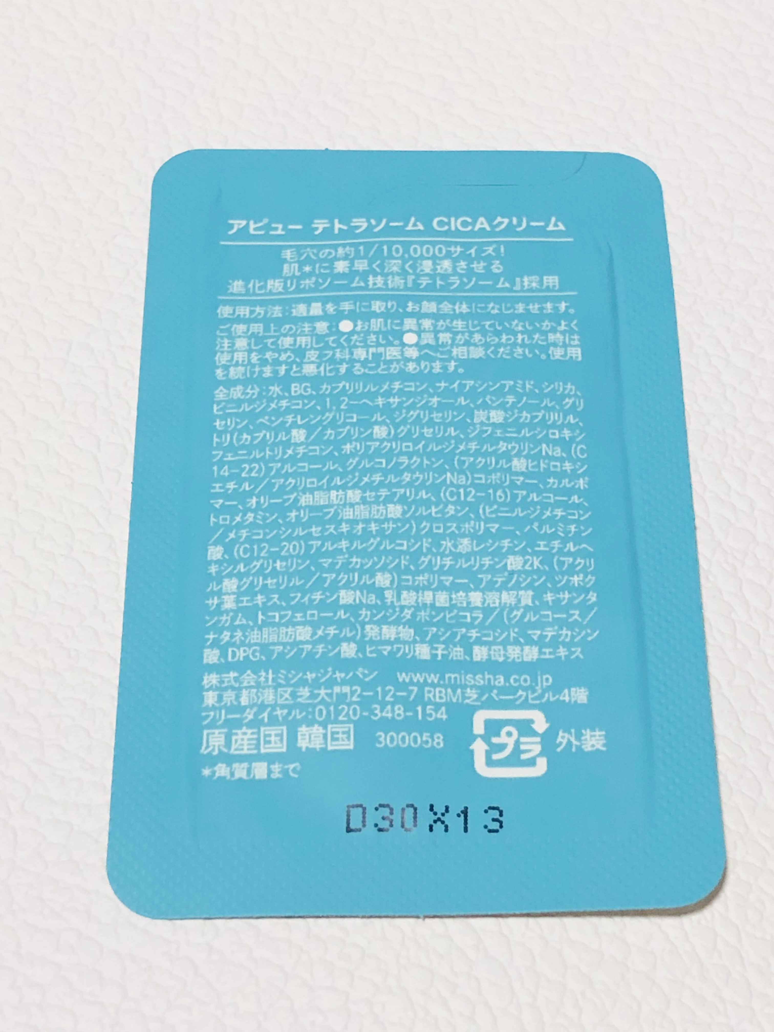 - <50g> シリカ、水、ペンチレングリコール、BG、グリセリン、ジグリセリン、ジフェニルシロキシフェニルトリメチコン、キサンタンガム、カルボマー、トコフェロール、グリチルリチン酸2K、炭酸ジカプリリル、エチルヘキシルグリセリン、DPG、水添レシチン、(アクリル酸ヒドロキシエチル/アクリロイルジメチルタウリンNa)コポリマー、パンテノール、パルミチン酸、1,2-ヘキサンジオール、ヒマワリ種子油、トリ(カプリル酸/カプリン酸)グリセリル、ナイアシンアミド、(C12-20)アルキルグルコシド、マデカッソシド、ツボクサ葉エキス、トロメタミン、アデノシン、(C14-22)アルコール、アシアチコシド、マデカシン酸、アシアチン酸、カプリリルメチコン、(C12-16)アルコール、オリーブ油脂肪酸セテアリル、オリーブ油脂肪酸ソルビタン、乳酸桿菌培養溶解質、(ビニルジメチコン/メチコンシルセスキオキサン)クロスポリマー、グルコノラクトン、(アクリル酸グリセリル/アクリル酸)コポリマー、ポリアクリロイルジメチルタウリンNa、フィチン酸Na、ビニルジメチコン、カンジダボンビコラ/(グルコース/ナタネ油脂肪酸メチル)発酵物、酵母発酵エキス