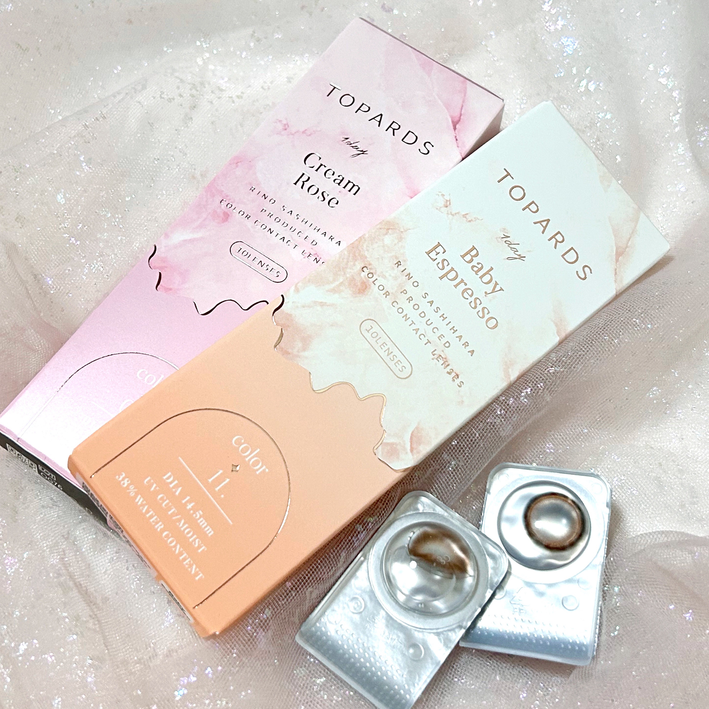 - ※2025年6月以降、商品パッケージ裏面・側面の一部表記を順次変更いたします。尚、これにかかる商品の交換・返品は承っておりません。 ■UVカット 紫外線を99%カットします。 ※UV-A波75%、UV-B波99%カット ■低含水 長時間の装用を考えた、レンズ自体に必要な水分が少ない低含水レンズです。※使用時間には個人差がありますので必ず眼科医の指導に従って下さい。 ■レンズ構造 着色剤がポリマー層によりレンズ内に包埋しています。 ■ 非イオン性レンズ 汚れが付きにくく視界をクリアに保ち、快適さが持続します。※装用感には個人差があります。 ■レンズ形状レンズ形状 フチに丸みをつけより快適な着け心地を目指しました。 Moon Melt Brown(ムーンメルトブラウン) とろける甘さのブラウンカラーに月の光を散りばめた、きらめき水光レンズ。 Cat Pearl(キャットパール) くっきり細フチでまんまるな印象の瞳♡きゅるんと子猫っぽグレーレンズ。 Jelly Quartz(ゼリークォーツ) ぼかし細フチでぷるんと輝くような瞳に、毎日使いたくなる引き算大人盛れレンズ。 カラーコンタクトレンズの不適正使用による眼障害の危険性等などがあります。 ●コンタクトレンズは高度管理医療機器です。不十分な洗浄・消毒など不適切なケアや、長時間・交換期間を超えた装用により、アレルギー性結膜炎、角膜感染症、角膜潰瘍等の重篤な眼障害が発生する危険性があります ●ご使用前に取扱説明書を確認してください 使用上の留意事項 ●眼科医院等を受診してからお求めください ●眼に異常を感じたら直ちにレンズ使用を中止し、お近くの眼科等で診察を受けてください ●医師の指示にしたがってご使用ください ●コンタクトレンズを装用する場合、自覚症状がなくても、眼科医院等での定期検査を受けてください ●レンズに不具合がある場合は使用しないでください
