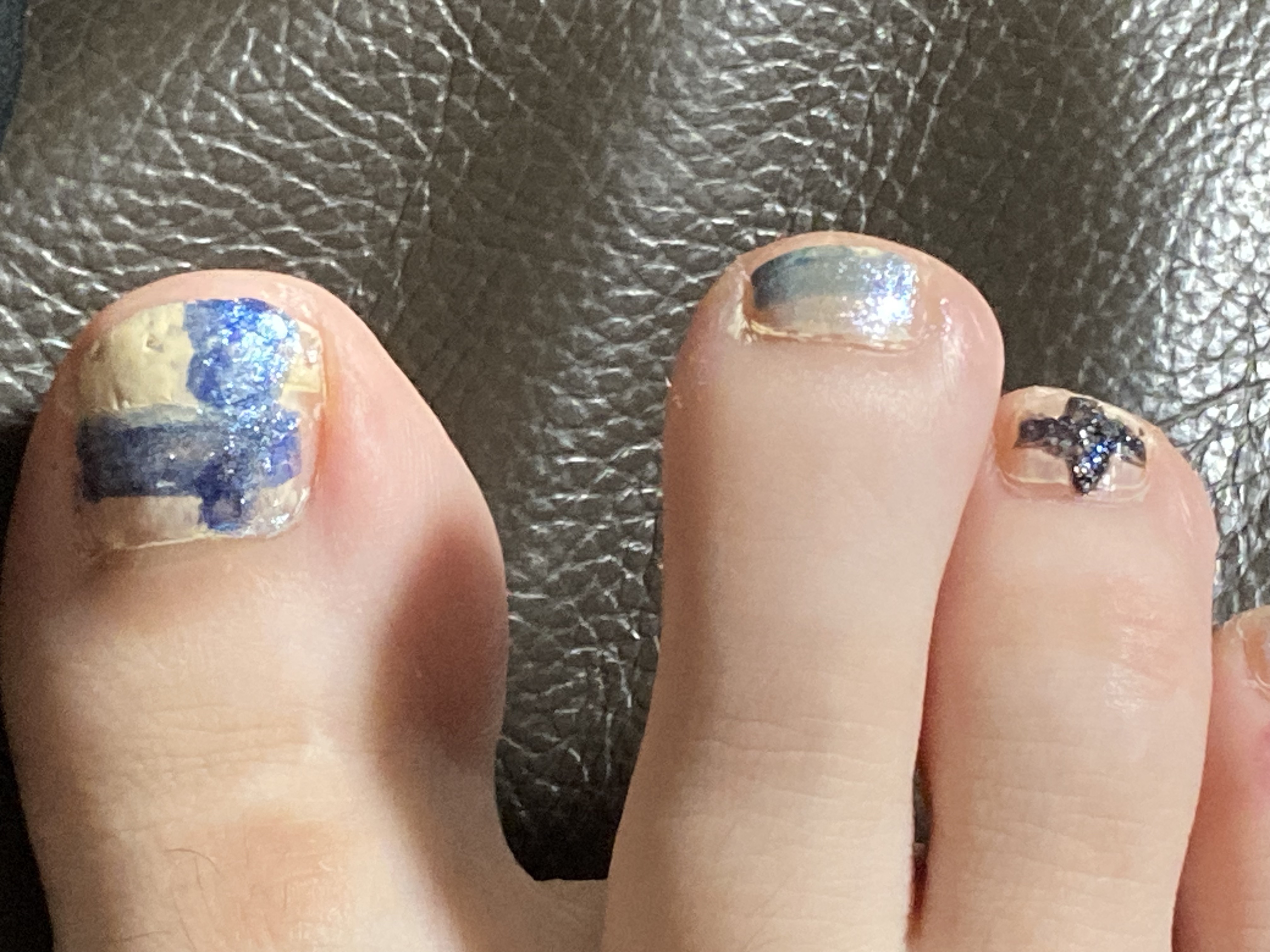 ネイルホリックBL909フットネイルは3度塗りけっこう1度塗りは薄付き2度塗りでも色は付いたけど3度塗りで青が強くならないかなぁ???どうかなぁ???とやってみたぁけど、水色だわぁ😅公式のサンプル画像ではもう少し青みが強かったけど。。。実際に...