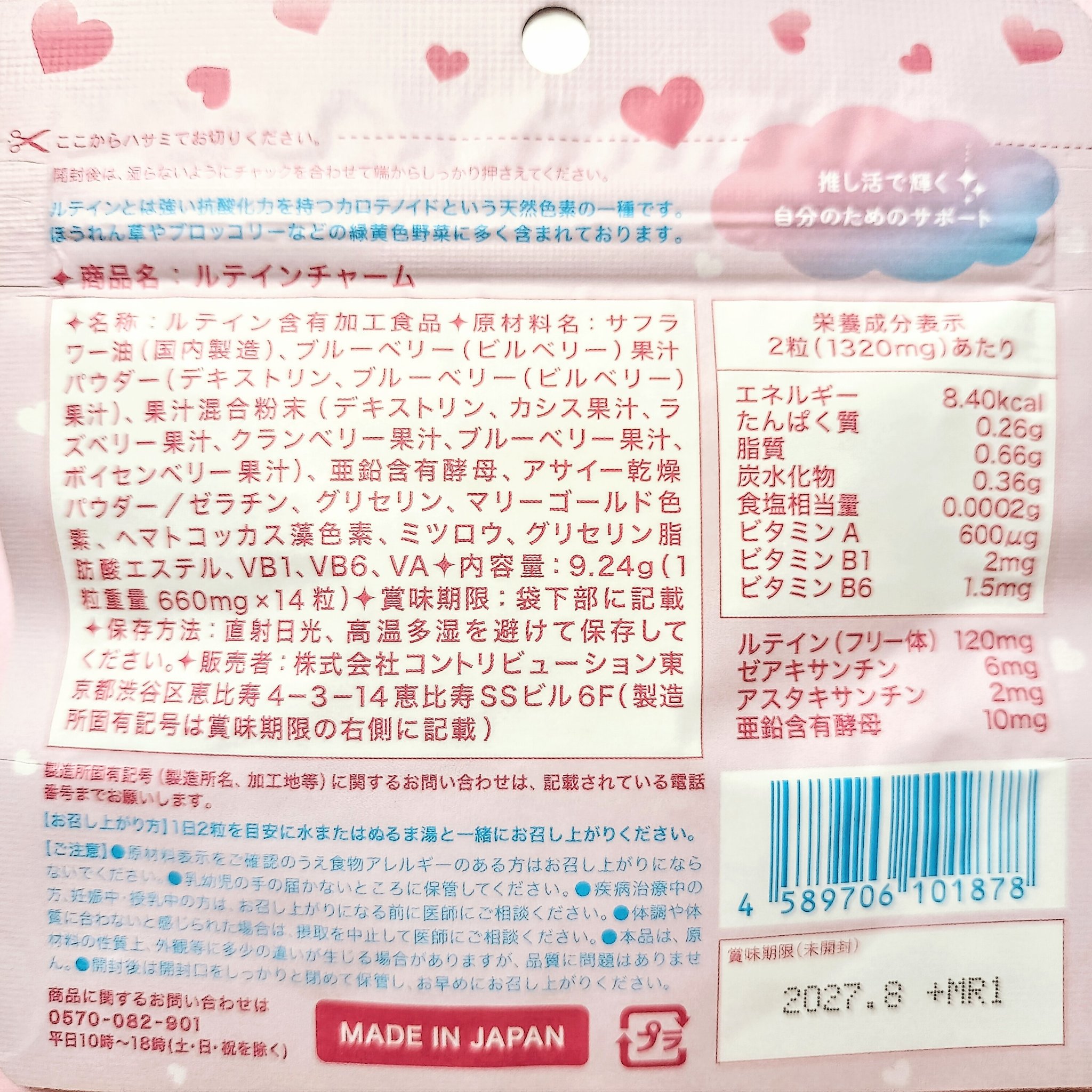 - ライブの日で髪型・洋服をかわいくしているなら持ち物もすべて可愛くしたい! そんな要望を叶えたかわいいパッケージのサプリ。 毎日の推し活に寄り添う。 ルテインチャームは内容量を1週間分と少なくして手に取りやすい価格に設定した商品です。 さらに品質にもこだわっており、ルテインの含有量も120mg(2粒当たり)でブルーベリーやビタミンA・ビタミンB1・ビタミンB6も入っており、美容成分も摂取ができる商品。 1日1~2粒が目安です。