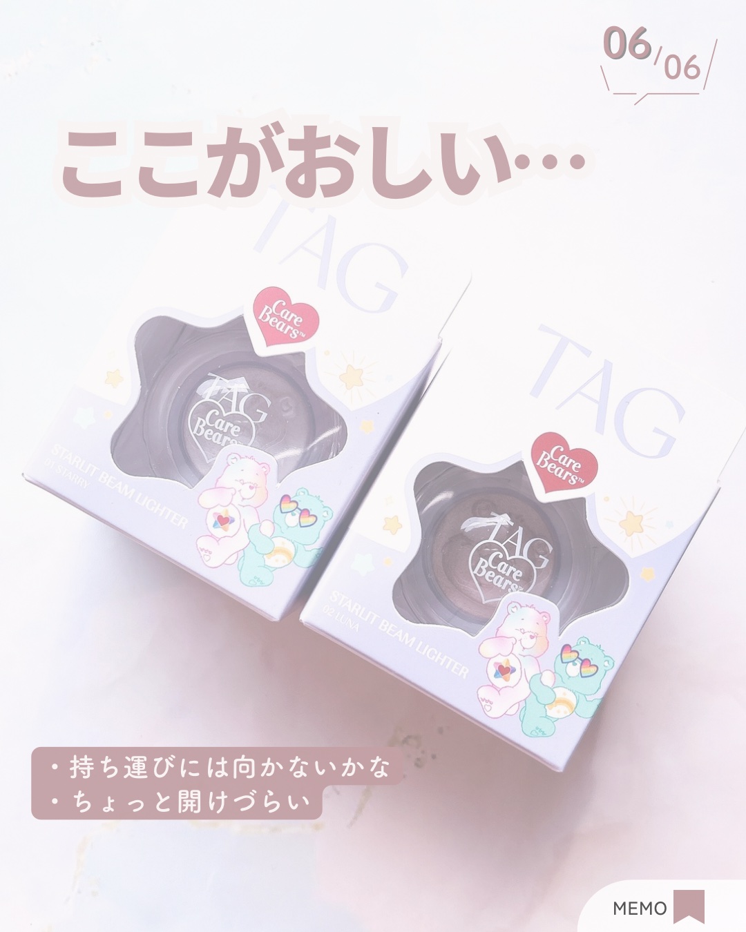 TAG発売前からバズっていたケアベアコラボがついに発売!!🌟スターリットビームライター#01スターリット#03オーロラポンっとつけるだけでキラキラハイライトに✨01は鼻筋や目頭に、03はチークに重ねづけして顔に立体感を出してます🙌手のひらサイ...