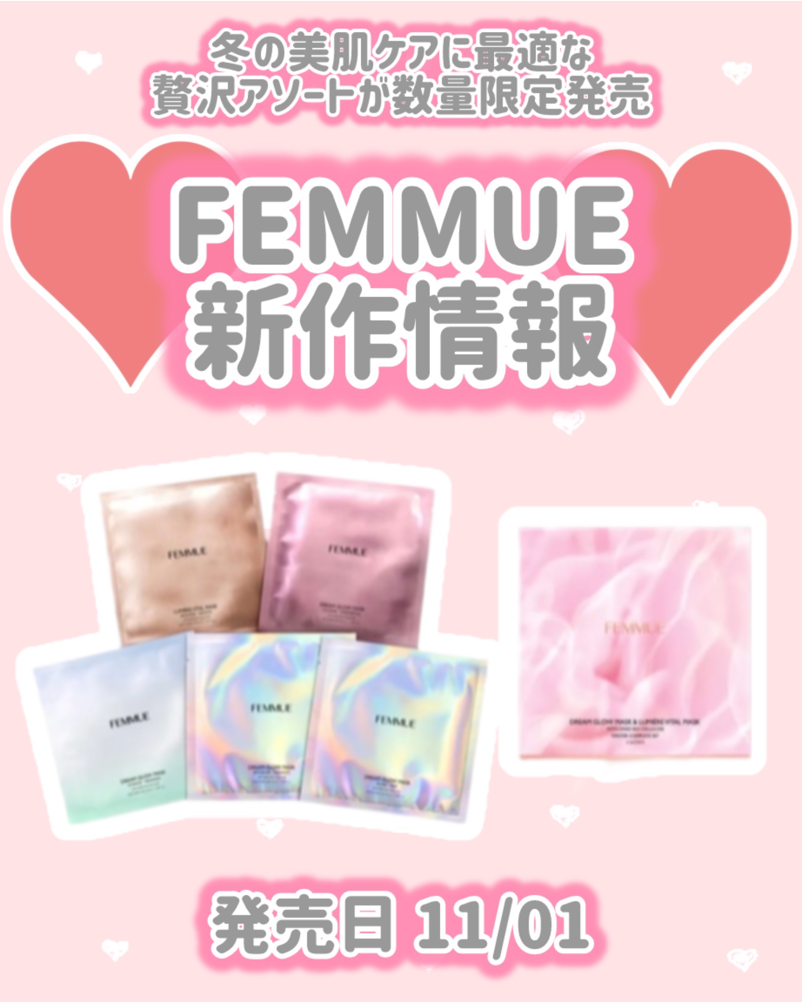 - 【2025クリスマスコフレ】〈数量限定〉 POINT1. 心地よい密着感と美容成分で肌を包み込むFEMMUE人気No.1カテゴリーのシートマスク5種を詰合わせ 花々の恵みや美容成分を惜しみなく肌へ届ける〈ドリームグロウマスク〉4種×1枚と、〈ルミエール ヴァイタルマスク〉1枚入り。5種のマスクを体験できるので、贈り物としてはもちろん、さまざまな種類をお試ししたい方にもおすすめです。 POINT2. 毛穴やくすみにアプローチする〈ルミエール ヴァイタルマスク〉がリニューアルして登場! 乾燥によるくすみや毛穴をケアして、肌本来の光を放たせる、人気の「ルミエールライン」。その主役であり、ビタミンCを安定して肌に届けるビタミンC誘導体*3を筆頭に、透明感*1を出すナイアシンアミド、みずみずしさを保つMada Snow(マデカッソシド)、キメを整えるPHA*4などを配合した美容液を独自の素材に浸した、特別なシートマスクが本セット限定で新登場。 *限定パッケージ入り 〈セット内容〉 ・ルミエール ヴァイタルマスク クリア肌*1・キメ・角質ケア/32mL×1枚 (本セット限定) ・ドリームグロウマスク(CC)保護・高保湿*2/33mL×1枚(本セット限定) ・ドリームグロウマスク(RR)透明感*1・キメ/32mL×1枚 ・ドリームグロウマスク(PF)ハリ・ツヤ/32mL×1枚 ・ドリームグロウマスク(HR)保水・保湿/32mL×1枚 2025年11月1日(土)数量限定発売