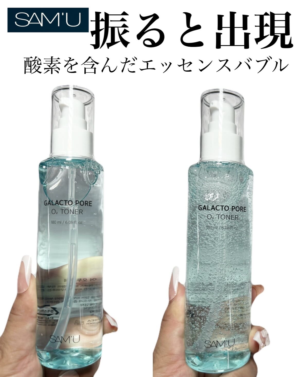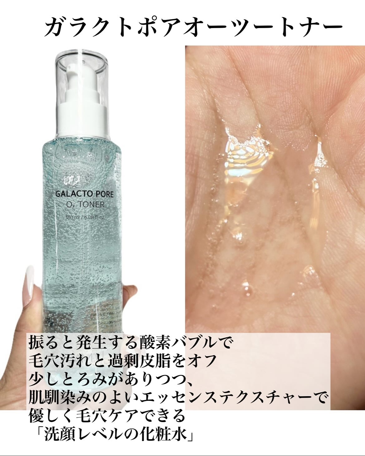 ガラクトポアオーツートナー 使用する前に振ったら酸素(O₂)が発生する酸素化粧水!! 酸素を含んだバブルが毛穴の老廃物と過剰皮脂で詰まっている毛穴の整頓をしてくれるんだとか!まるで専門エステを受けたような毛穴スケーリングができるトナーみたい! ガラクトミセス核心成分で7重毛穴ケア!! 低刺激だから敏感肌も安心して毛穴ケアできる!!