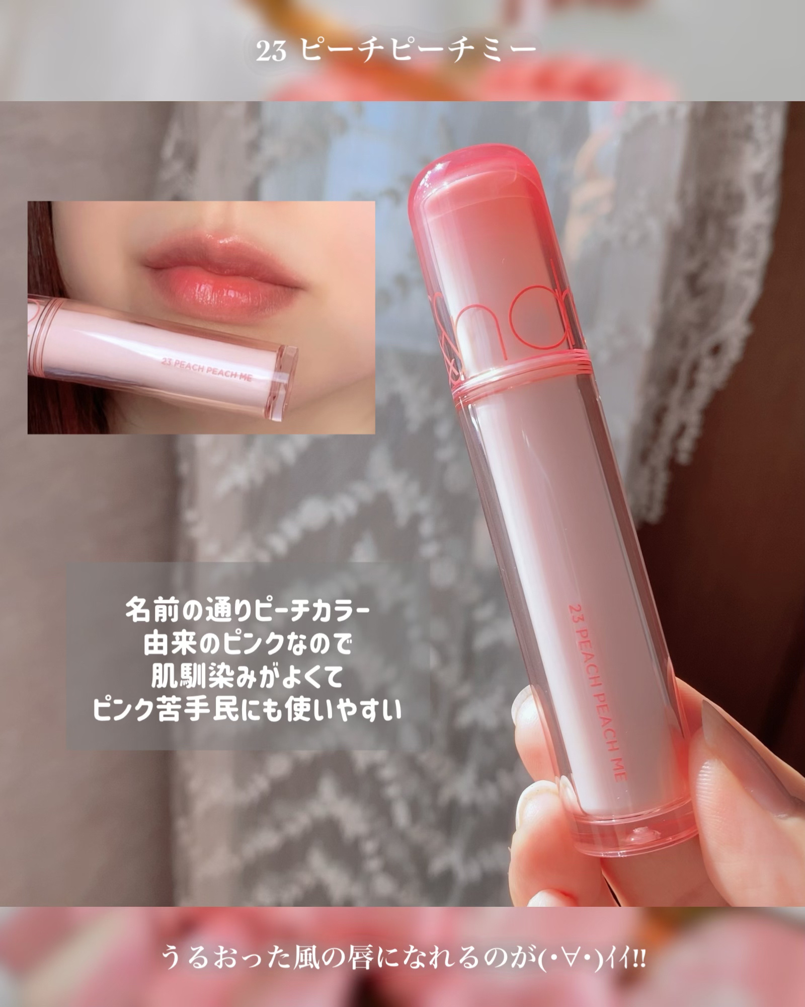 【rom&ndザジューシーラスティングティント20ジュジュフィグ/23ピーチピーチミー】ロムアンドさまからいただきましたrom&ndの人気リップ「ジューシーラスティングティント」がリニューアルして「ザジューシーラスティングティント」に!歴代ベ...