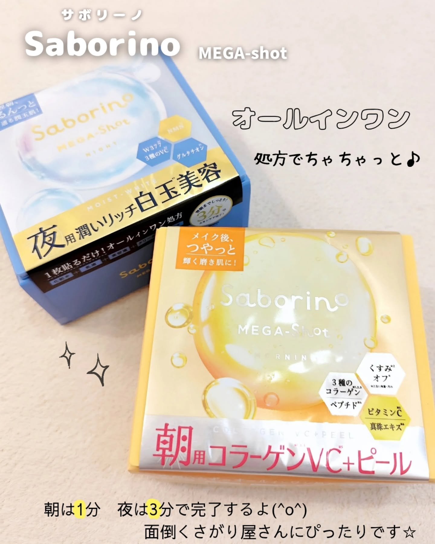 🛏️朝も夜も、時短でキレイ✨サボリーノメガショットシリーズを使ってみたよ!🌞朝用ツヤピールマスクCC寝起き肌に貼るだけで、洗顔・スキンケア・トーンアップが完了✨これ1枚でベースメイク前の準備が完成するの、まさに神時短!つるんとしたツヤ肌になれ...