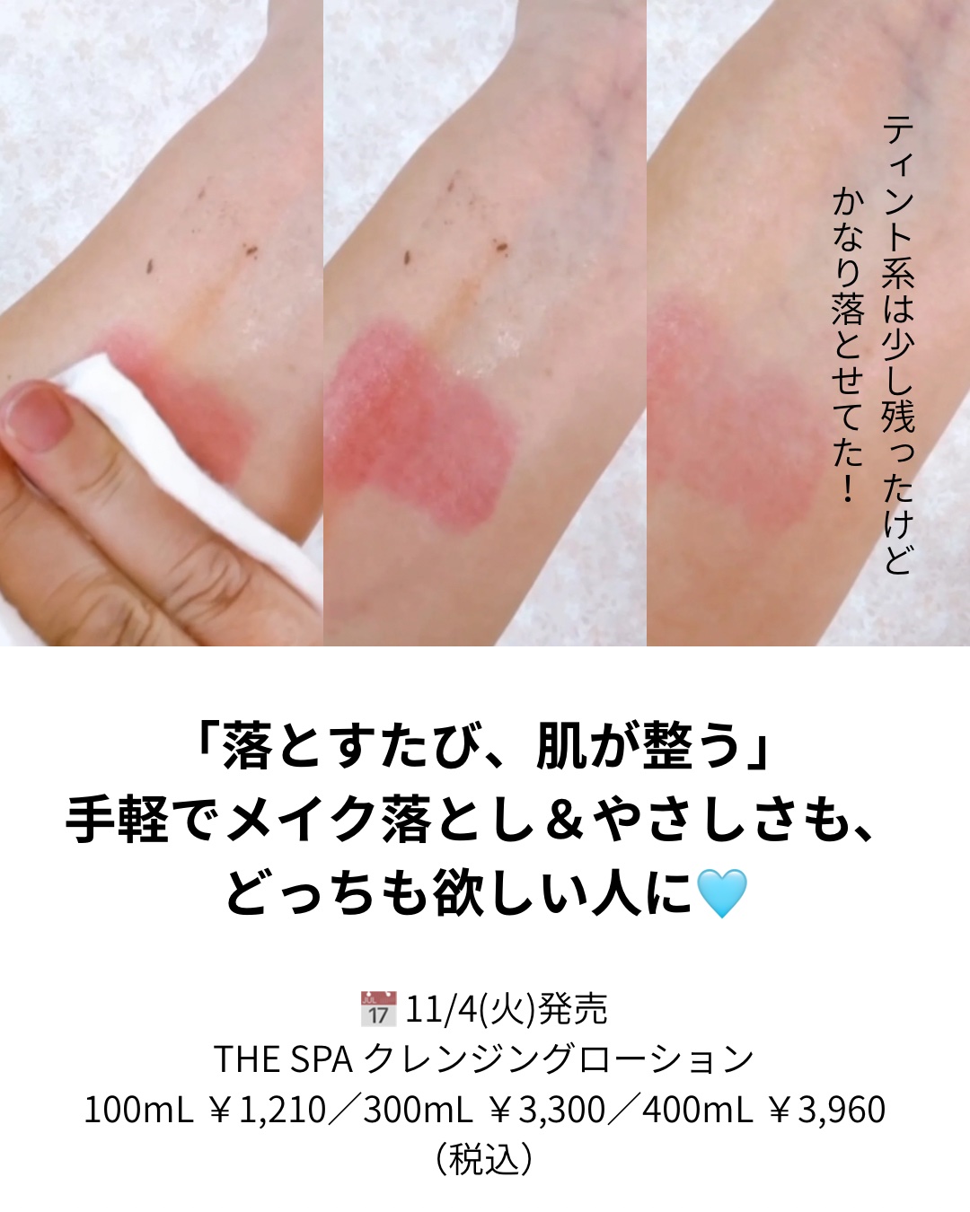 - メイク落としはもちろん、毛穴・角質・くすみ*1までケア*2。洗い流し不要のクレンジングローションがついに完成。 コットンに含ませて拭き取るだけ。ウォータープルーフのメイクから毛穴・皮脂汚れまでやさしく簡単に素早くオフ。 繊細な肌のために、温泉水(89%)を含むうるおい成分を96%、天然由来成分*3 91%配合。 べたつきを感じない、とろみのあるリッチなテクスチャーでしっとりうるおいのある素肌へ。 容器にはリユース資源*4を採用することで、環境負荷の低減や循環型社会の実現に向け取り組んでまいります。 香料・合成色素・石油系鉱物油・アルコール・オイル・パラベン・シリコン不使用 弱酸性 敏感肌の方の協力によるパッチテスト済み (すべての方に皮膚刺激が起こらないというわけではありません) *1 乾燥による *2 肌のキメを整えること *3 天然成分を科学的に反応させた成分を含む *4 400mLのみ