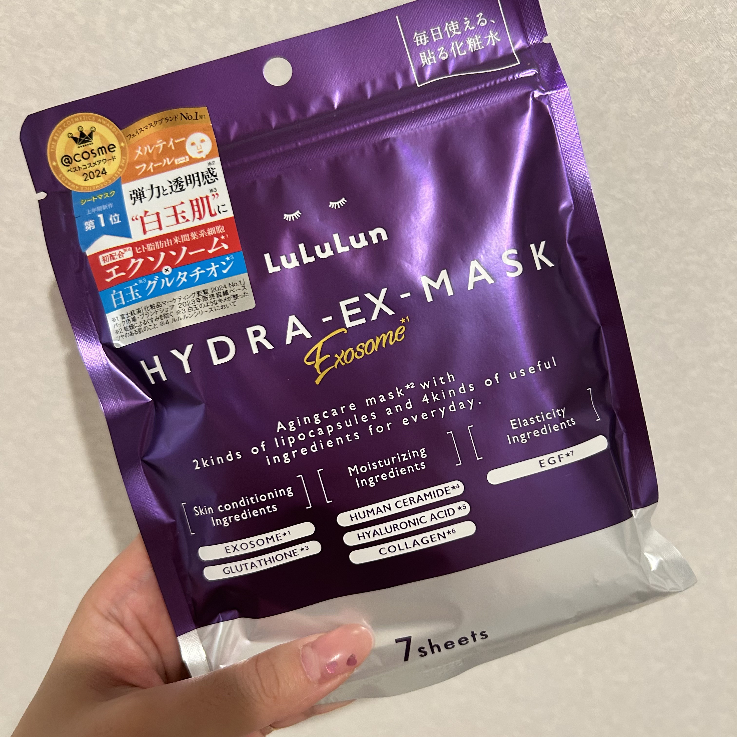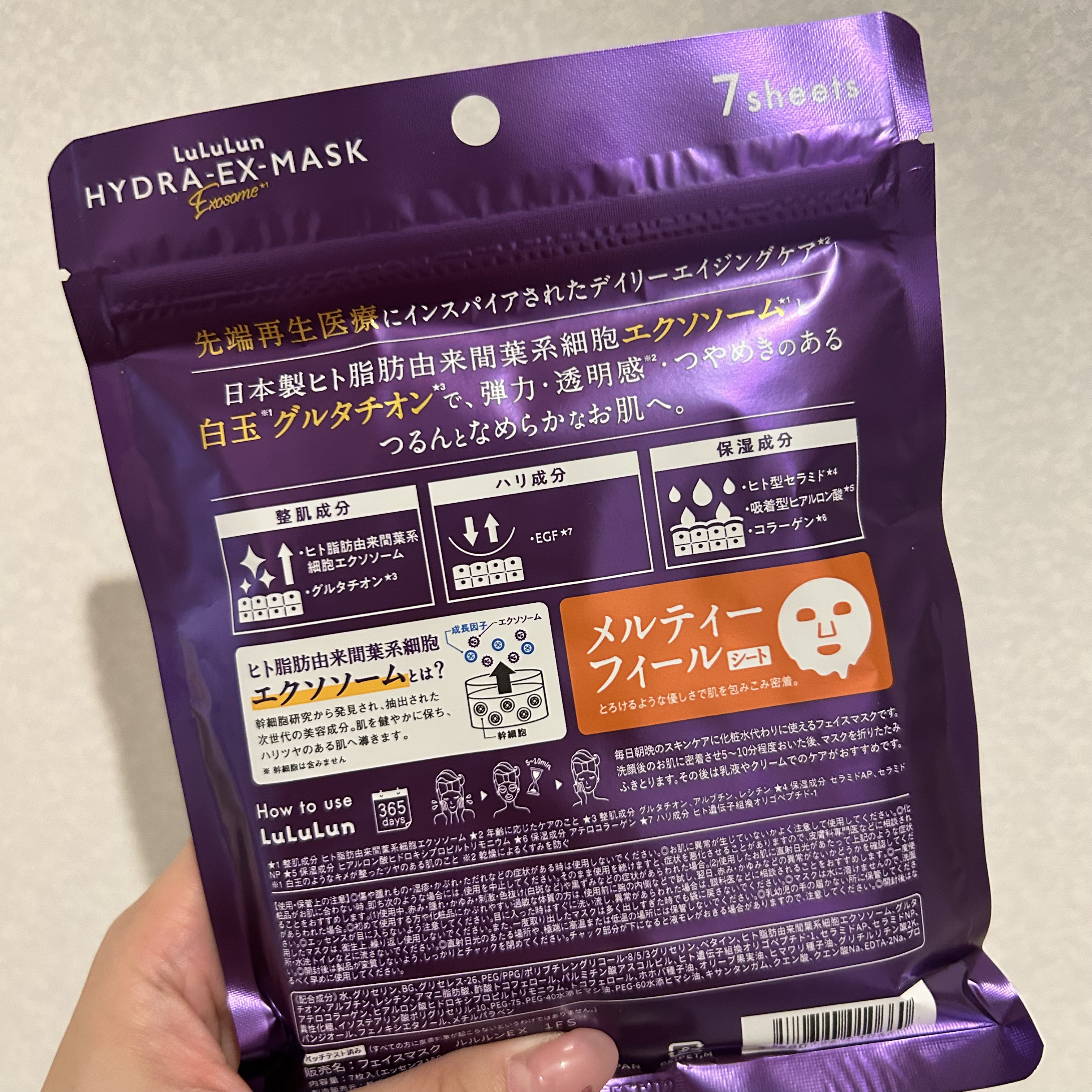 バズりすぎて今も売り切れや購入制限続出のルルルン ハイドラ EX マスク🤍 先端再生医療にインスパイアされたデイリーエイジングケアマスクで、日本製ヒト脂肪由来間葉系細胞エクソソームと白玉グルタチオンという今話題の成分が配合されています🔎 とろけるような柔らかいシートでつけると気持ちよくて、さすがルルルンとなりました🥰 しっかり保湿して透明感のある肌に ルルルン共通のいいところはそのままに、肌のハリツヤケアができてこの価格はバズるのも納得です💯