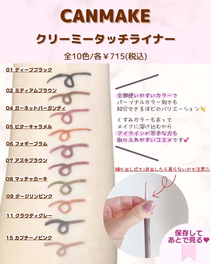 プチプラなのにデパコス越え?✨あゆみみです🩷パーソナルカラーやコスメの耳より👂🏻な情報を16タイプ・パーソナルカラーアナリスト®のプロ目線でご紹介していきます💫...本日は【CANMAKEクリーミータッチライナー】全10色をパーソナルカラー別...