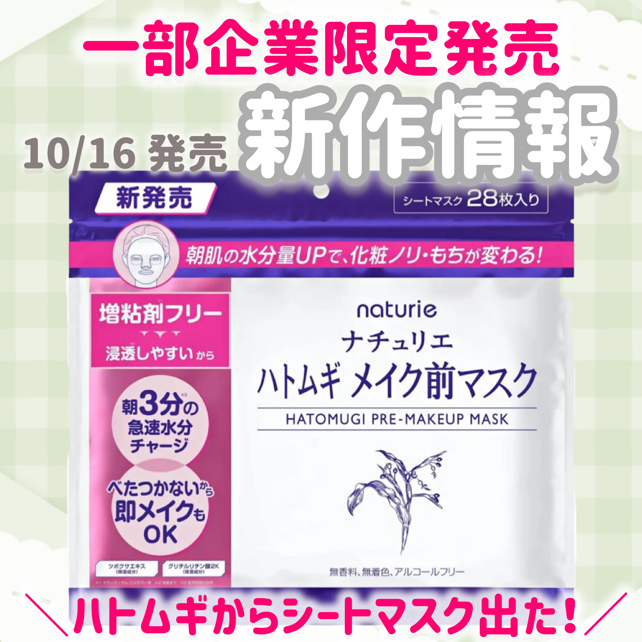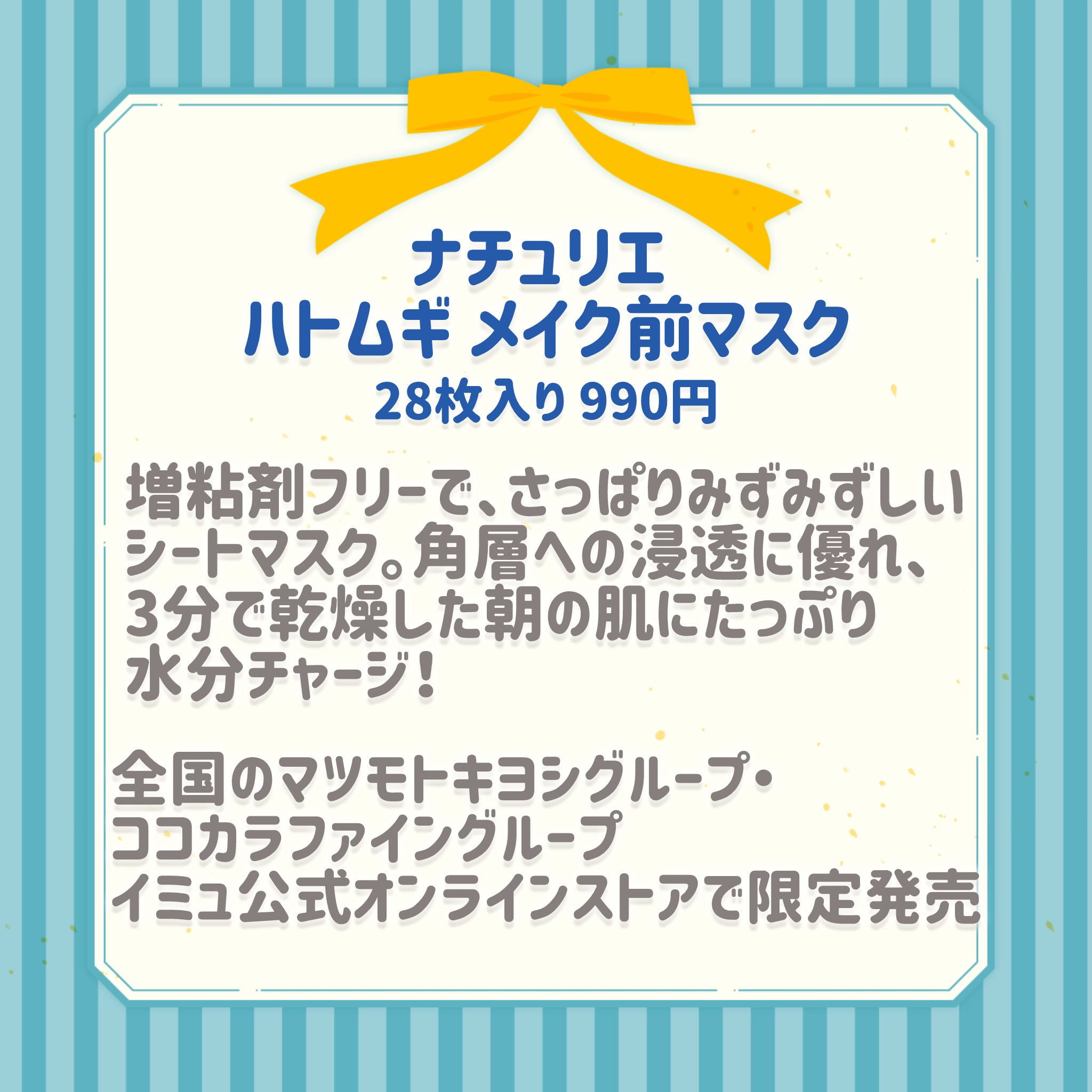 化粧ノリ・もちが朝の3分で変わる!ナチュリエハトムギシリーズから新作メイク前マスクが出た✨ナチュリエハトムギメイク前マスク(ナチュリエスキンコンディショニングマスク)28枚入り¥990(税込)こんにちは!うみかです!いつも♡📎フォローありがと...