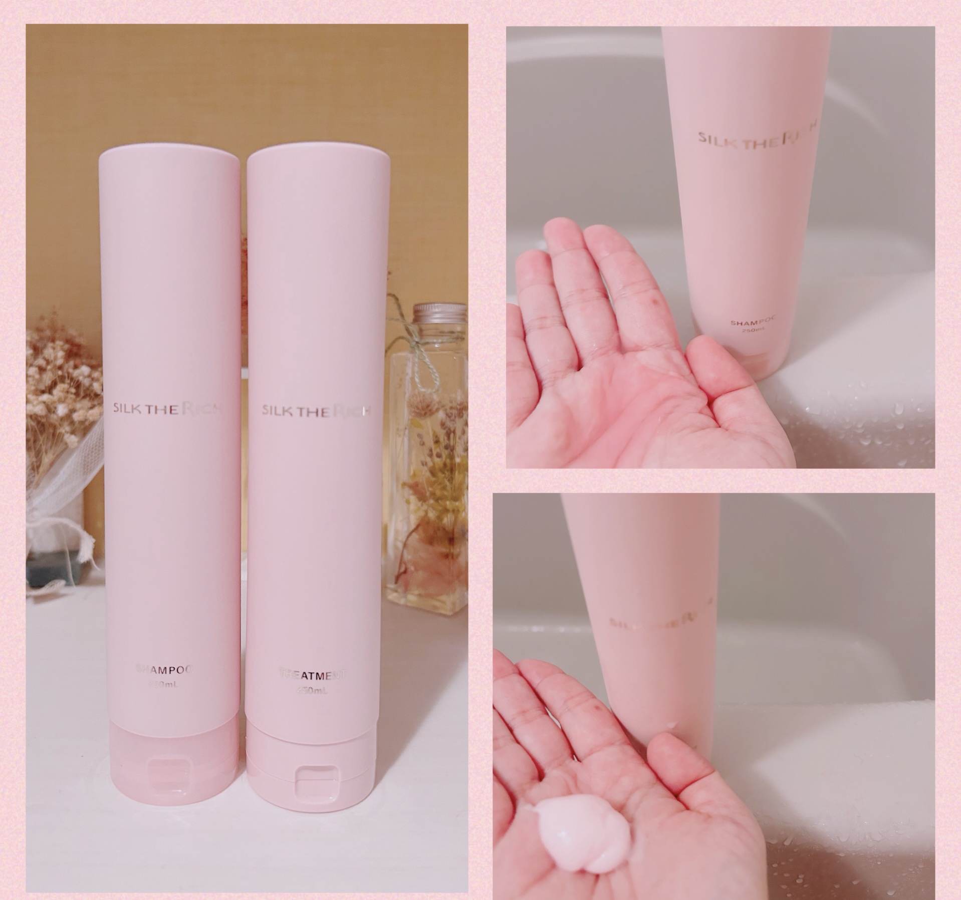 シルクザリッチ ザ・リッチハイモイスト&リペアシャンプー・トリートメントピンクのボトルにシャンプー、トリートメントメントまでピンク🩷香りは、香水のように香るエレガントな「アンヴェールロゼブーケ」です🌹絹ぷる髪」に導くこだわりの使用感洗顔泡のよ...