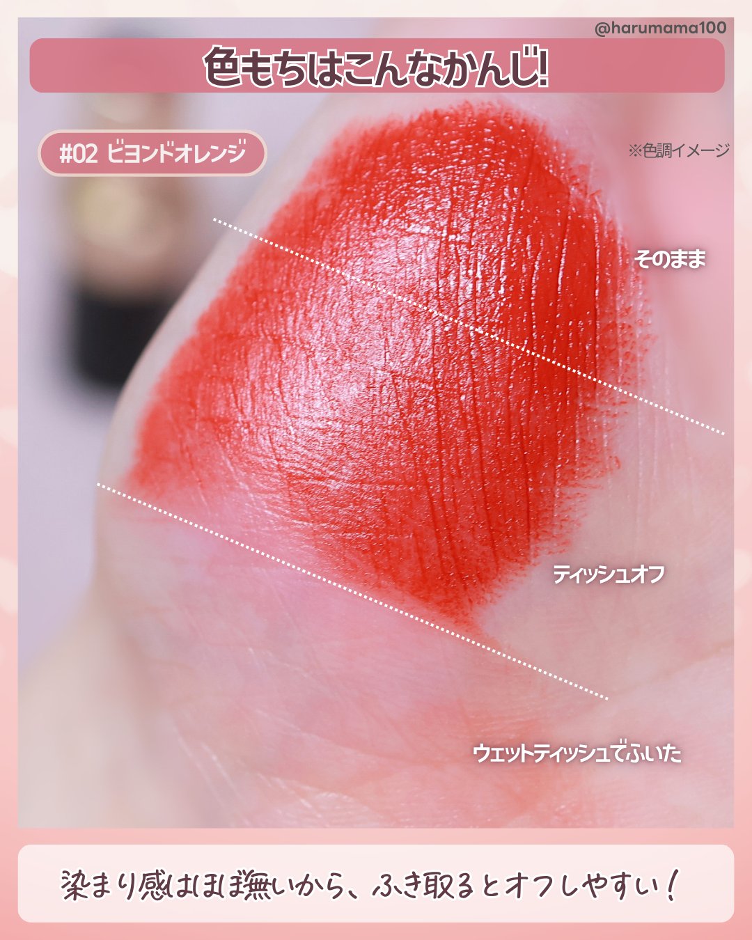 - 軽いオイル原料でシルクのように柔らかくなじみ唇にしっかり密着するシルキーベルベットテクスチャーで、色素の分散効果をサポートする細かいパウダーの組み合わせが均等な演出を唇全体に与え鮮やかな発色を実現します。